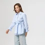Блузка женская, полуприлегающего силуэта из хлопковой ткани в полоску, длиной чуть ниже линии бёдер. Застёжка фронтальная потайная на петли и пуговицы. По переду нагрудные вытачки и декоративный элемент в виде завязывающегося пояса с драпировкой.Спинка с талиевыми вытачками. Рукав длинный, втачной на притачной манжете. Воротник рубашечно-отложной на стойке. Низ блузки фигурный, снизу в боковых швах имеются разрезы.