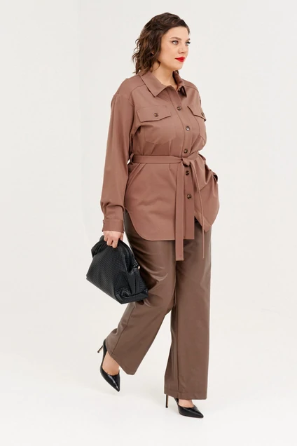 Жакет-рубашка выполнен из трикотажного полотна. Свободного силуэта со спущенной линией плеча. Низ фигурной формы. По переду кокетки, накладные карманы с клапаном. Воротник отложной без стойки. Центральная застежка-планка на петлю и пуговицы. Рукав длинный с притачной манжетой по низу. Линию талии можно подчеркнуть съемным поясом. Длина изделия 78 см. В 50 размере: ОГ-114 см, ОТ -114см, ОБ 116см. В 52 размере: ОГ 118см, ОТ 118см, ОБ 120см. В 54 размере: ОГ 122 см, ОТ 122см, ОБ 124см.