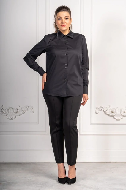 Блузка женская полуприлегающего силуэта с центральной бортовой с нестандартной застёжкой на петли и пуговицы, воротник стояче - отложной , полочка с накладными нагрудными карманами, с вытачками, спинка с отрезной кокеткой, с талевыми вытачками. низ фигурный, рукава втачные одношовные , на притачной манжете застёгивающимися на петли и пуговицы.