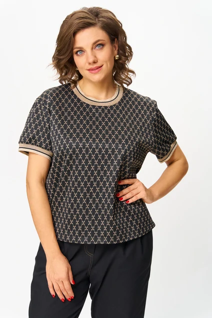 Элегантная женская блузка прямого силуэта, изготовлена из качественного трикотажного полотна. Она представлена в темном цвете с изысканным геометрическим принтом в золотистых тонах, что придает модели роскошный вид. Круглая горловина и одношовные короткие рукава акцентированы декоративной бейкой, добавляющей блузке изысканности. Эта модель идеально подойдет для создания как деловых, так и повседневных элегантных образов.