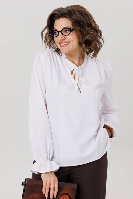 Эта эффектная блуза прямого силуэта станет незаменимым элементом вашего гардероба. Передняя часть блузы оснащена средним швом, который формирует элегантный вырез-щель, дополненный сборкой по плечевому шву для создания изысканного образа. Длинные втачные рукава свободного кроя украшены сборкой по низу и декоративными завязками, добавляя нотку игривости и оригинальности. Воротник-стойка, отделанный бархатной тесьмой, придает блузе особый шарм и утонченность. Этот великолепный вариант идеально подходит как для повседневной носки, так и для выхода в свет, позволяя вам выглядеть стильно и уверенно в любой ситуации.