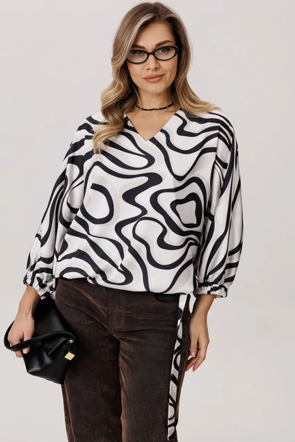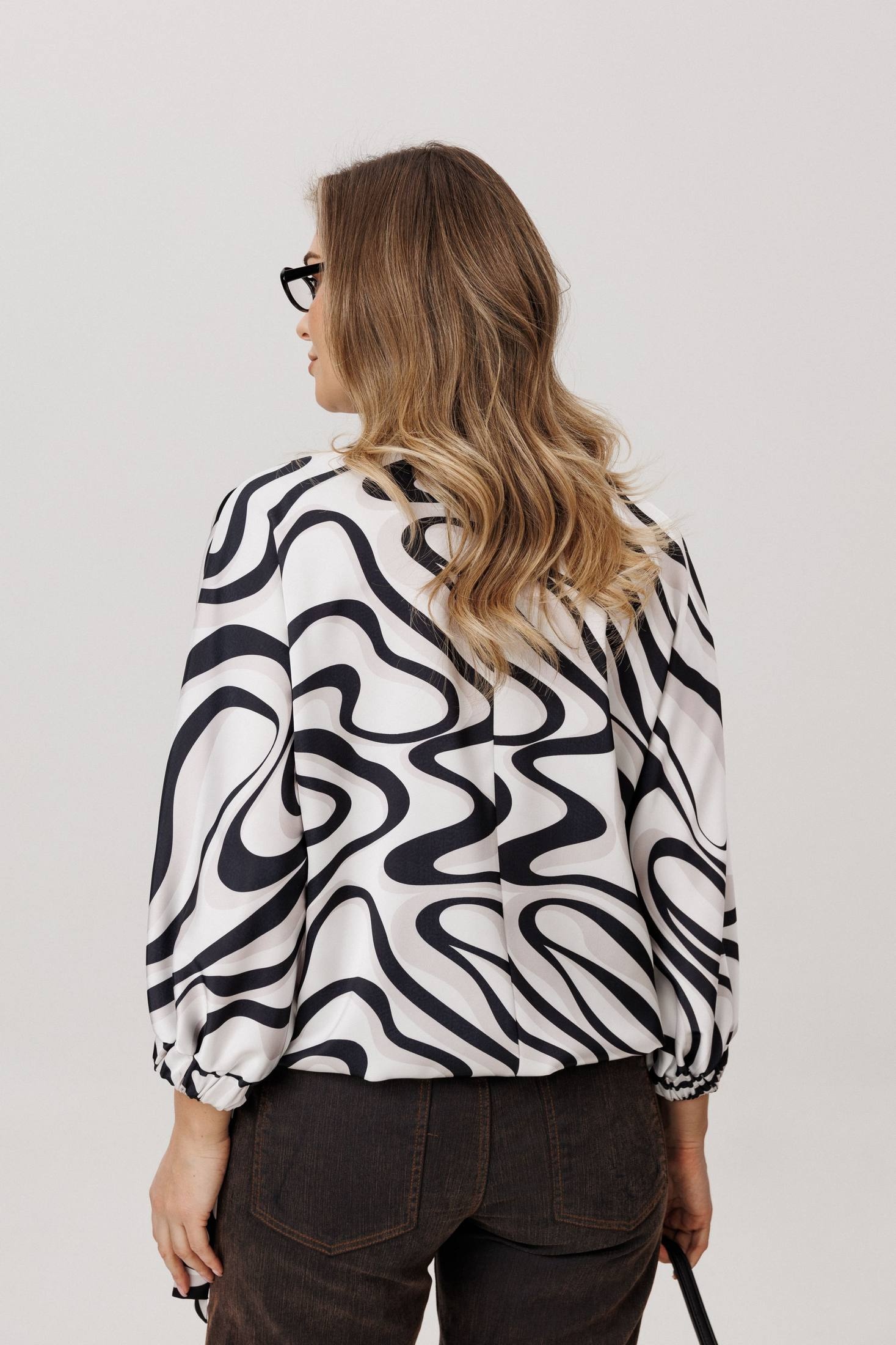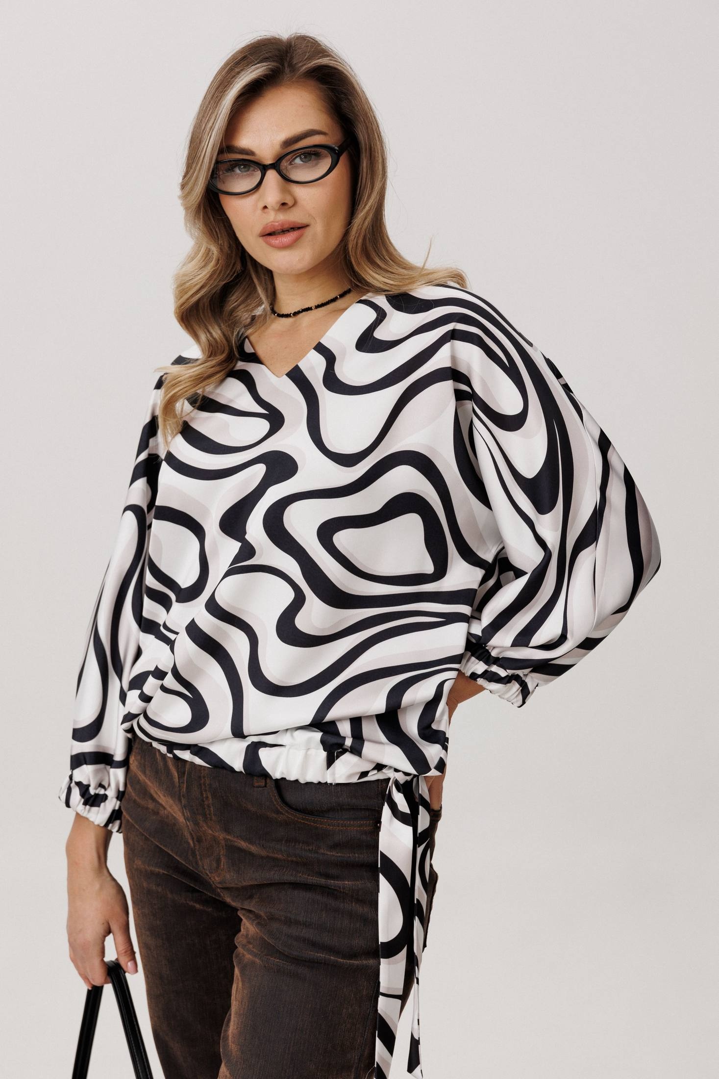 Особую динамику и индивидуальность блузе придают детали: цельнокроеные рукава три четверти подчёркивают целостность и плавность линий, а притачной пояс и манжеты, собранные в нежную сборку благодаря эластичной резинке, создают выразительный контраст с текучестью основной ткани. Эта умная конструкция позволяет вам самостоятельно регулировать длину блузы, творчески преобразуя её силуэт - от парящего и расслабленного до более собранного и чёткого.