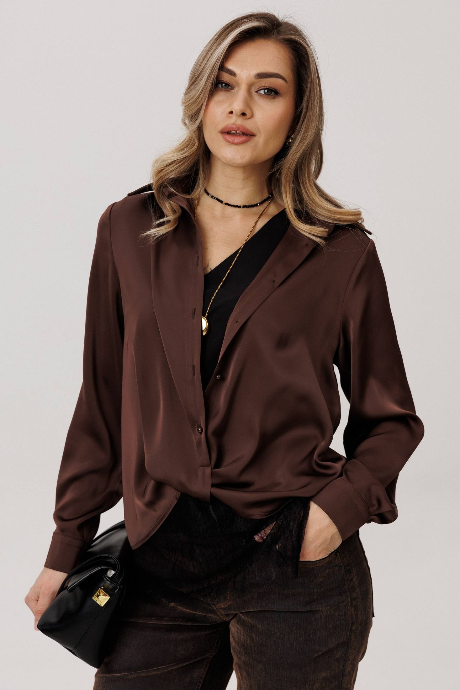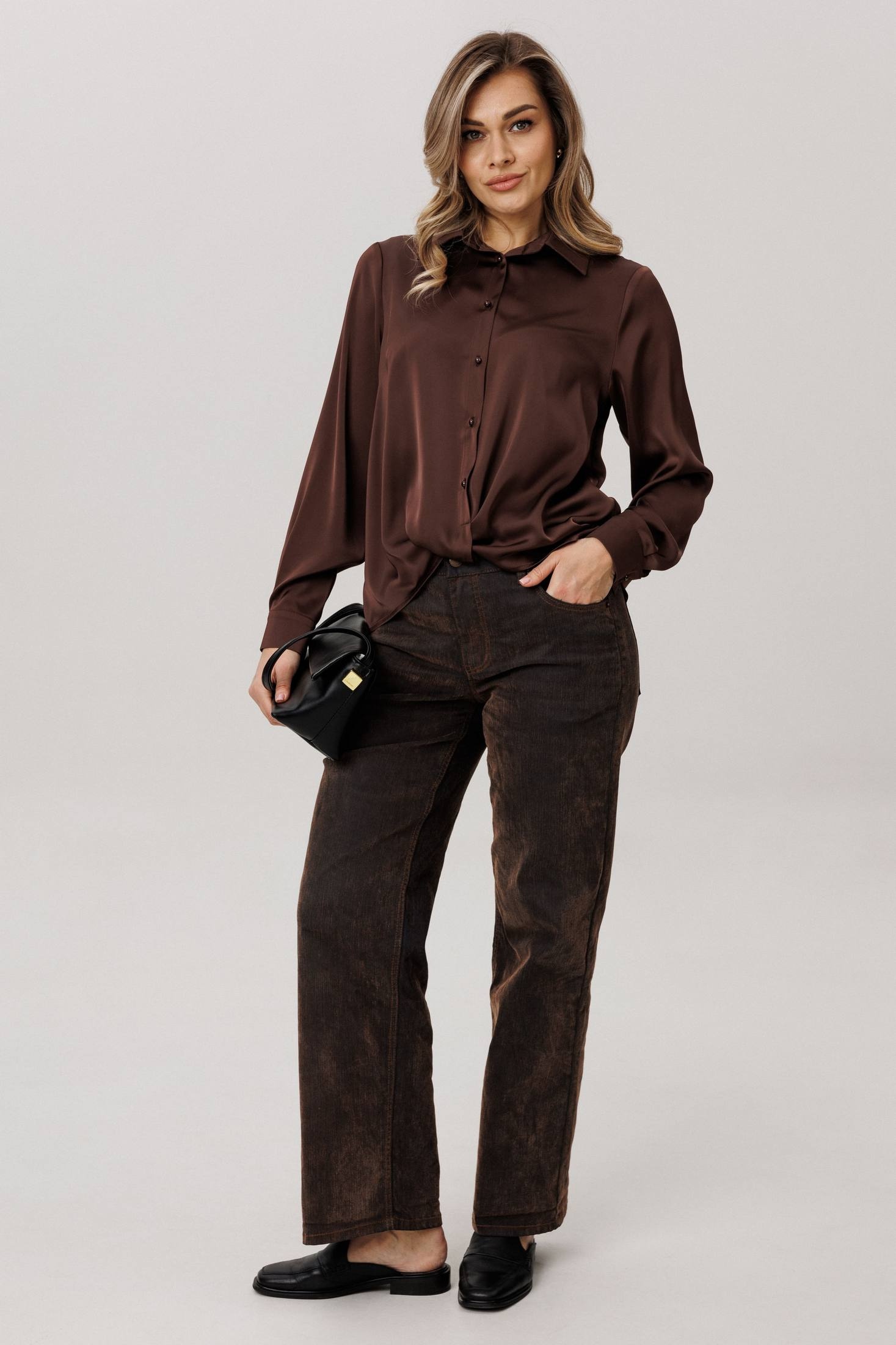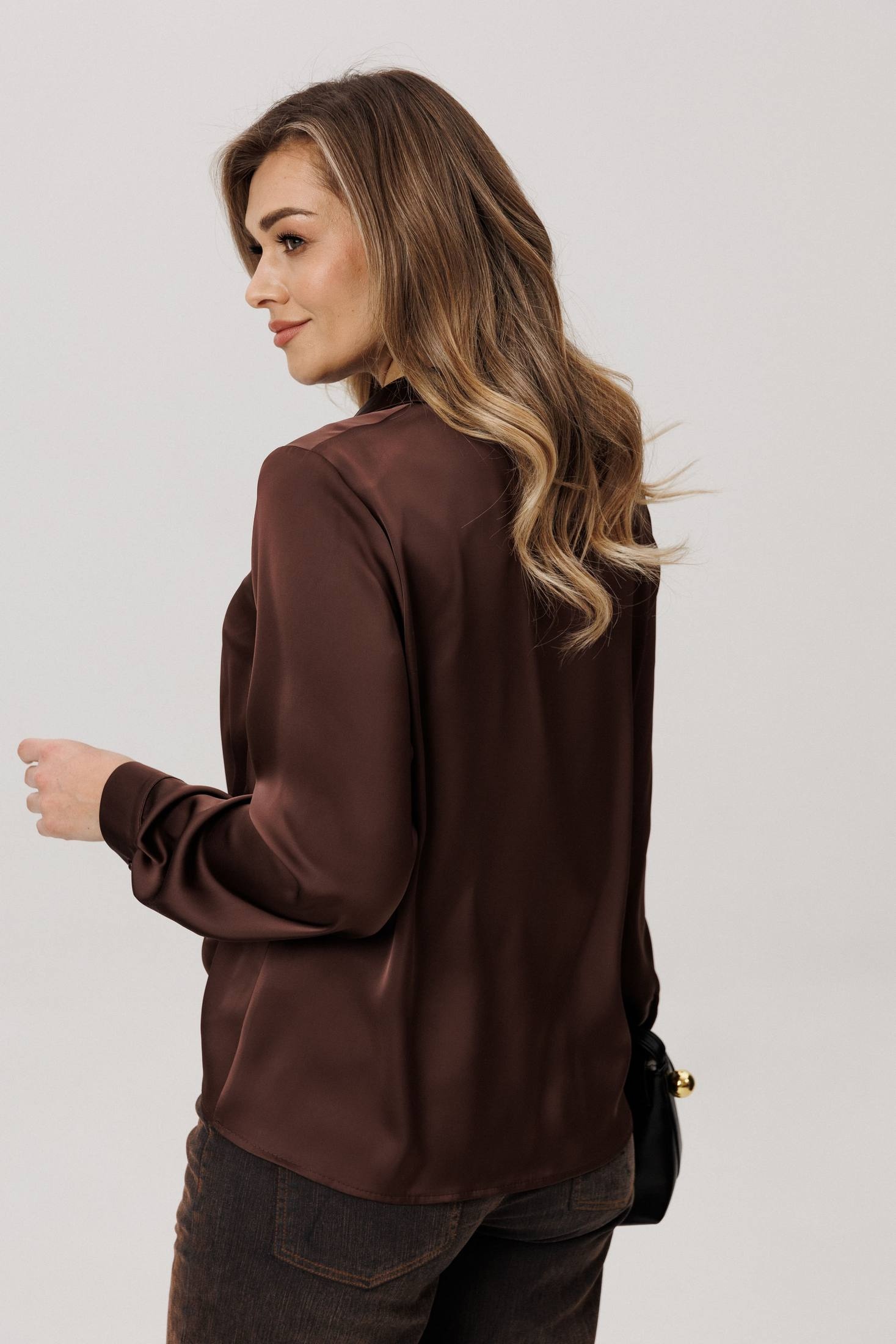Изящная блуза от Анелли, сотканная из современной роскоши. Её суть - в благородной ткани: струящейся, нежной, с глубоким и сдержанным блеском, которая облегает фигуру мягким, но уверенным потоком.