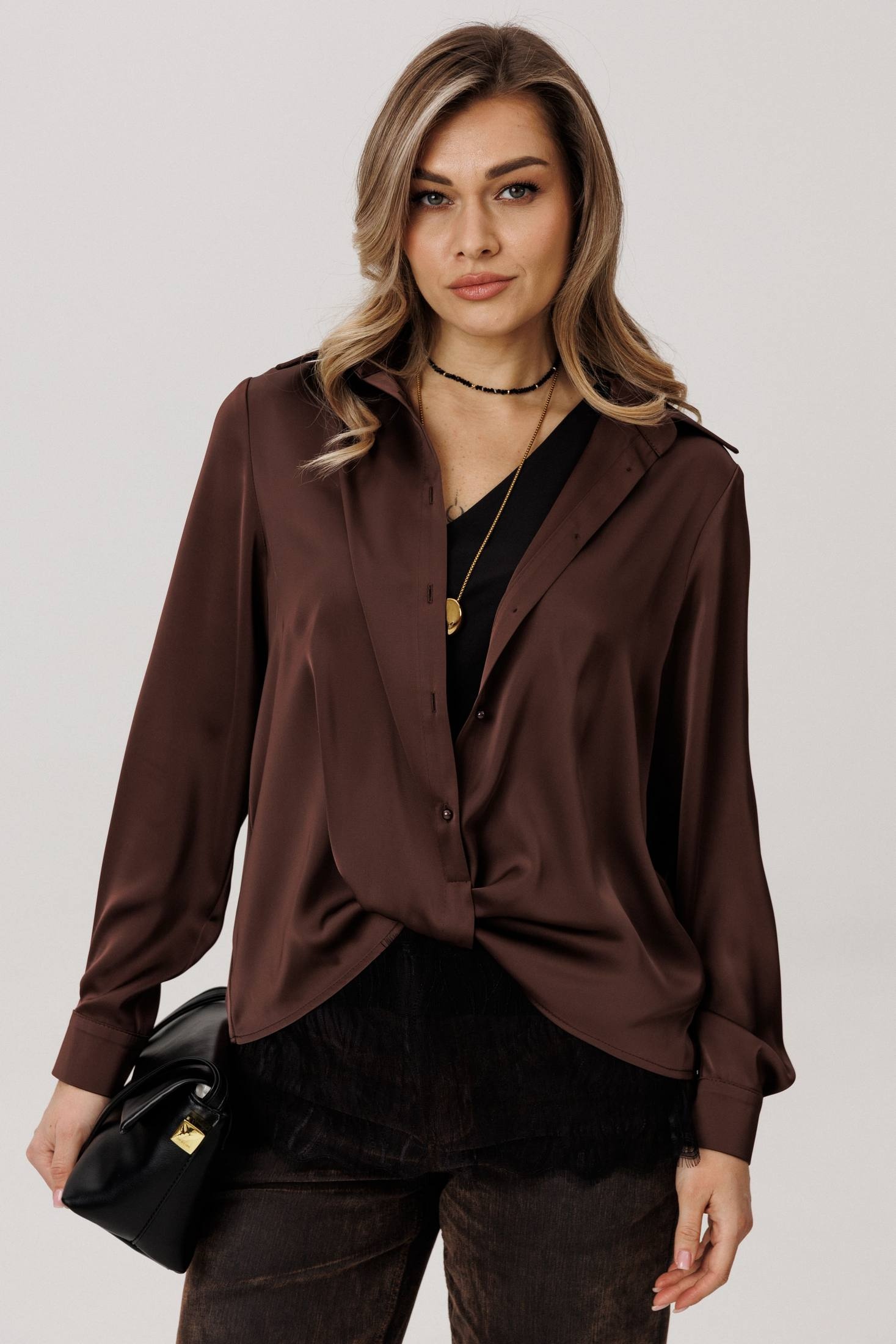 На модели в блузе цвета «горький шоколад» кружевной топ 1664.