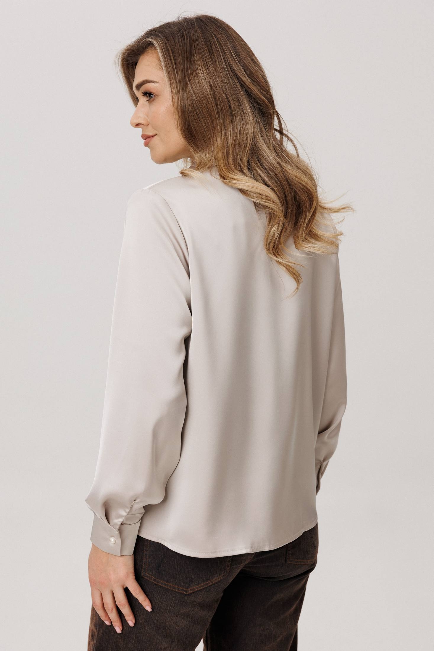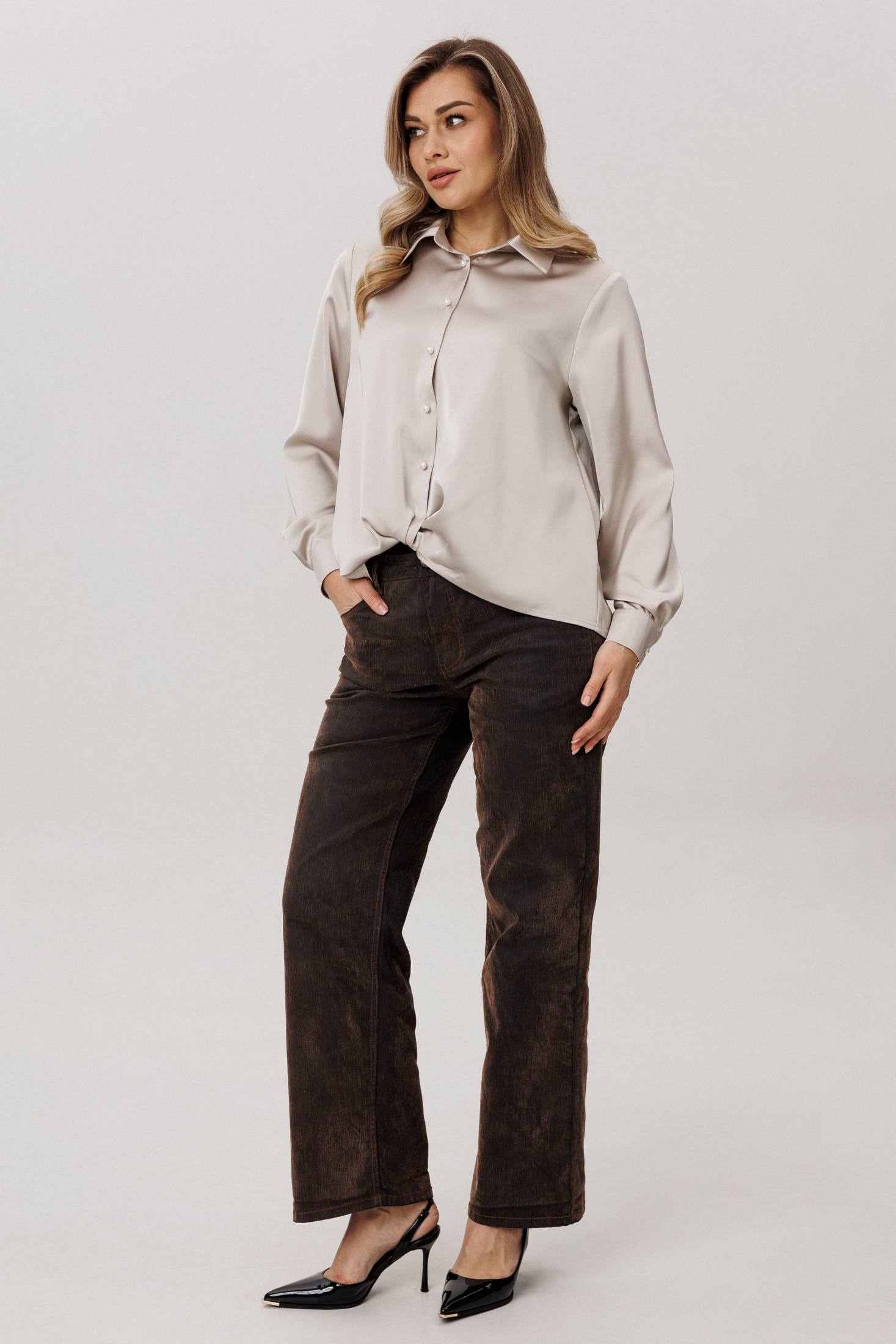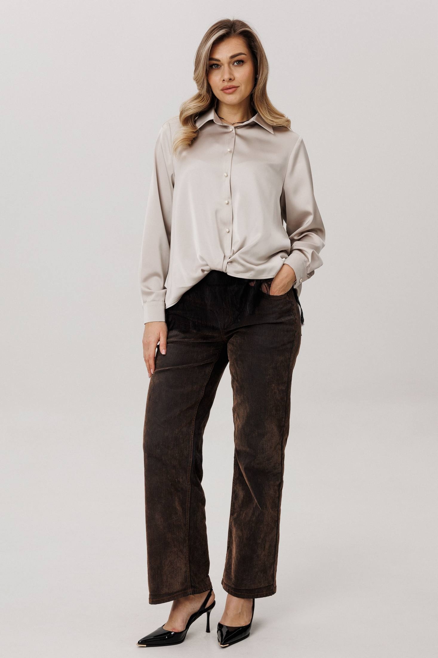 Изящная блуза от Анелли, сотканная из современной роскоши. Её суть - в благородной ткани: струящейся, нежной, с глубоким и сдержанным блеском, которая облегает фигуру мягким, но уверенным потоком.