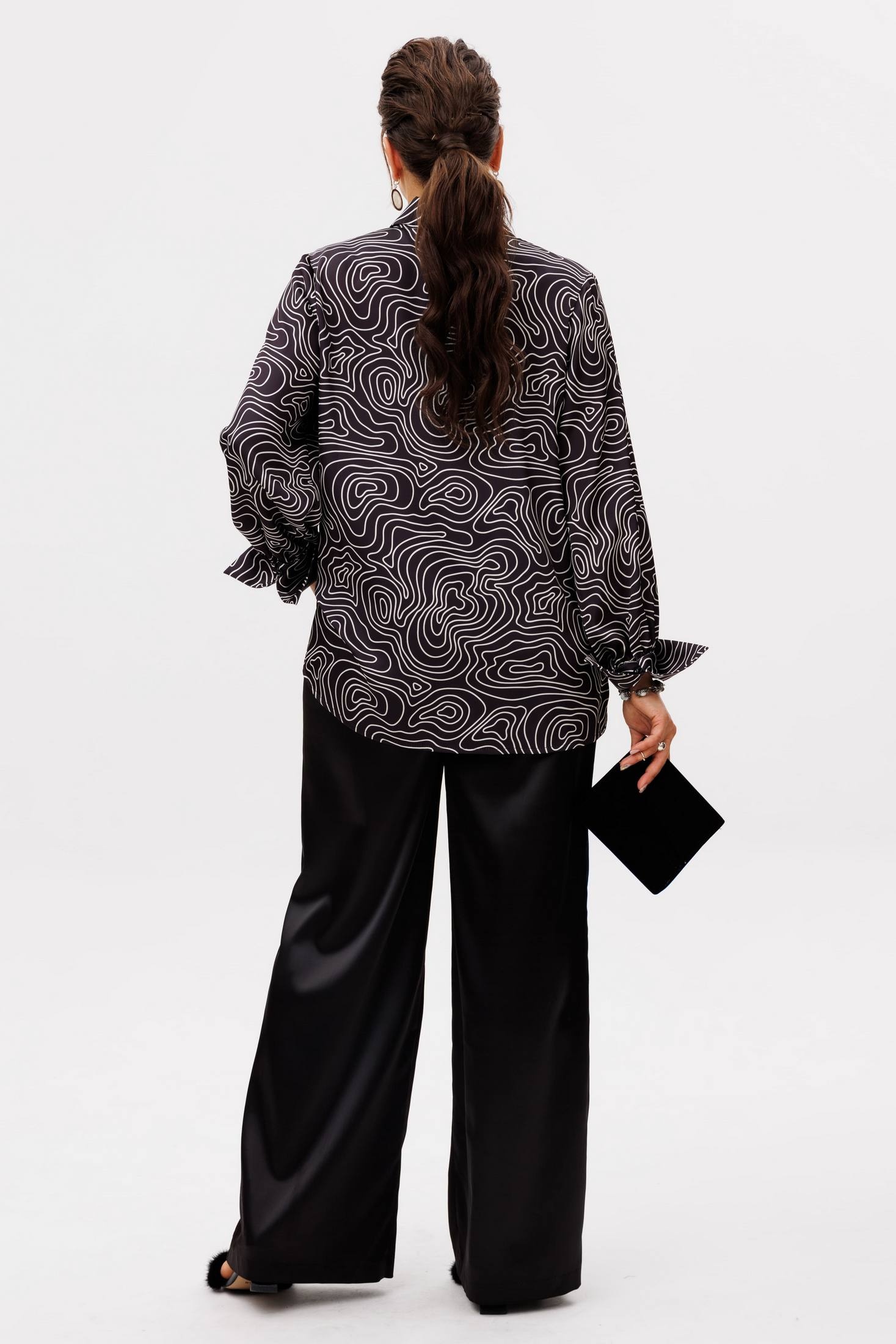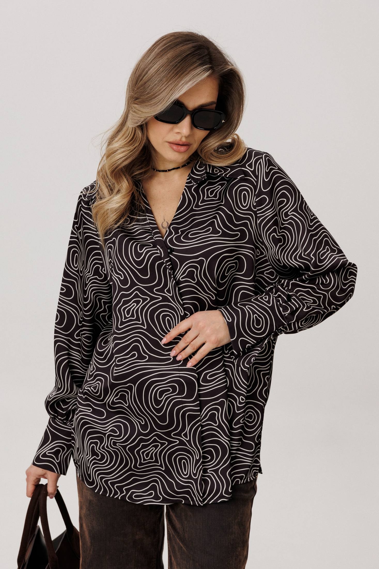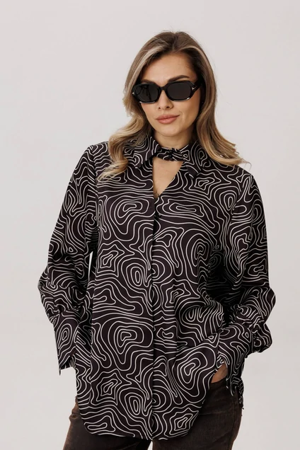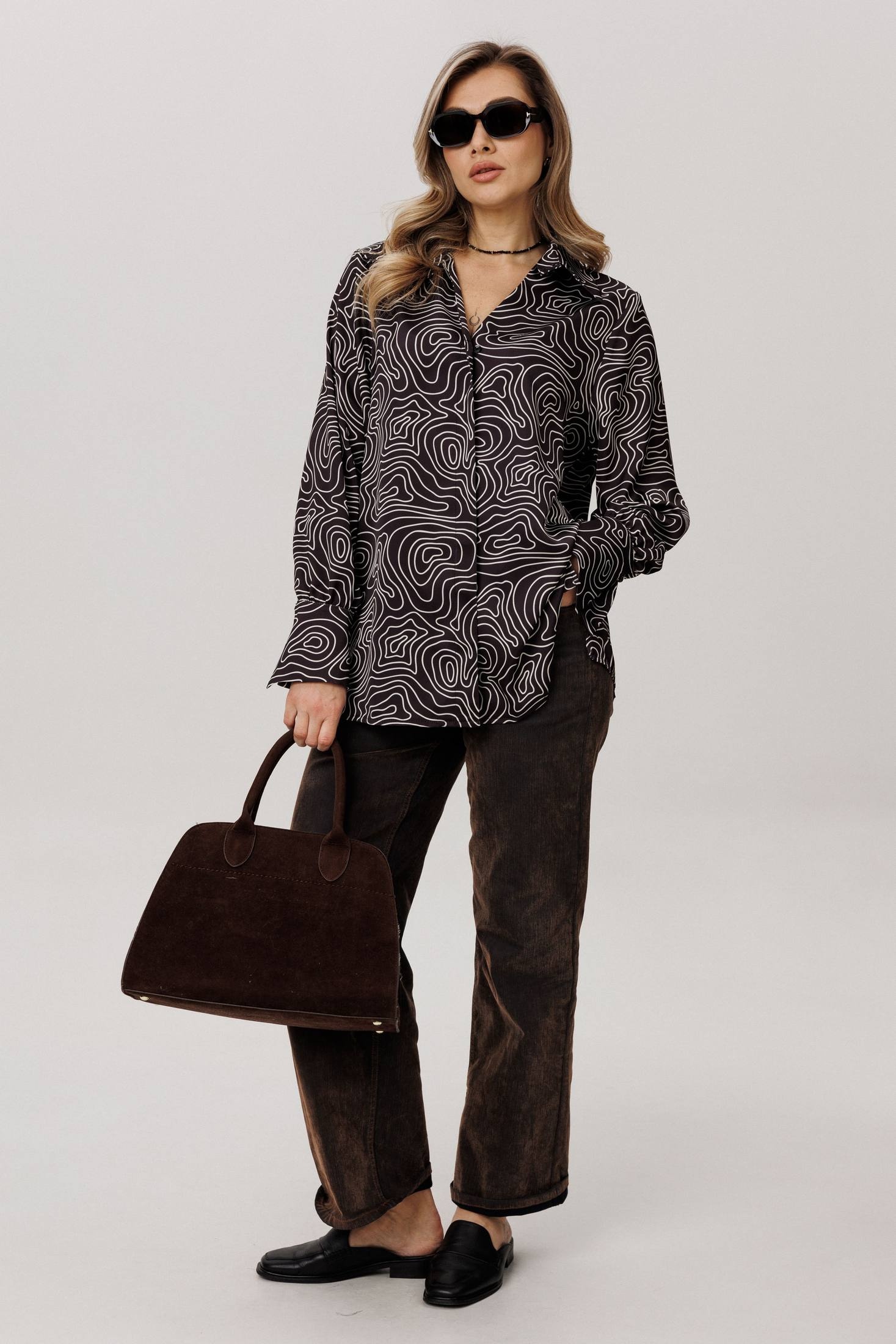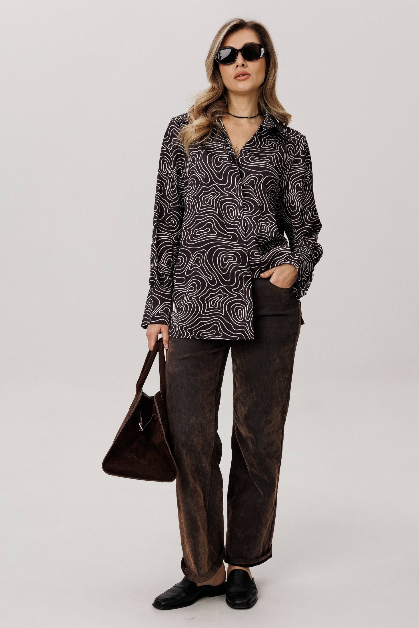 Мягкая, струящаяся вискоза с выразительным принтом обволакивает фигуру свободным, прямым силуэтом, даря невесомый комфорт и свободу движений. V-образный вырез, обрамленный элегантным воротником на стойке, становится главным аккордом всего образа - он подчеркивает линию шеи, придавая ей изысканную графичность и собранность. Этот элемент - та самая изюминка, что превращает повседневную вещь в предмет особого шика, говорящий о вашем внимании к деталям.