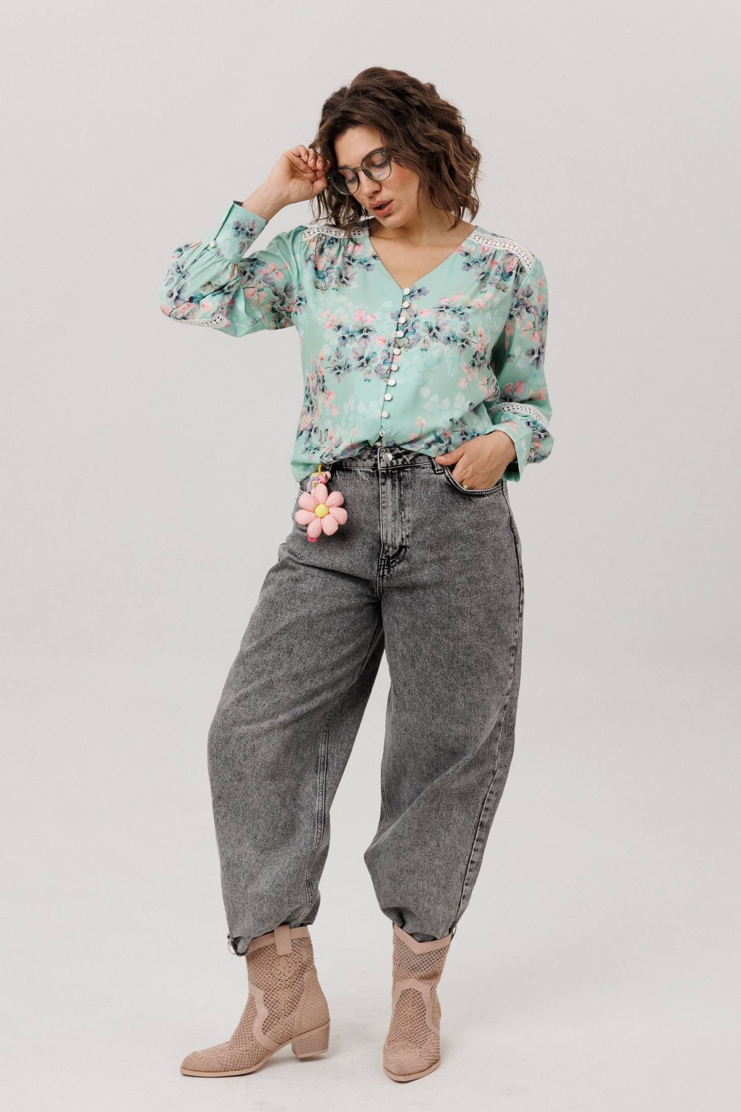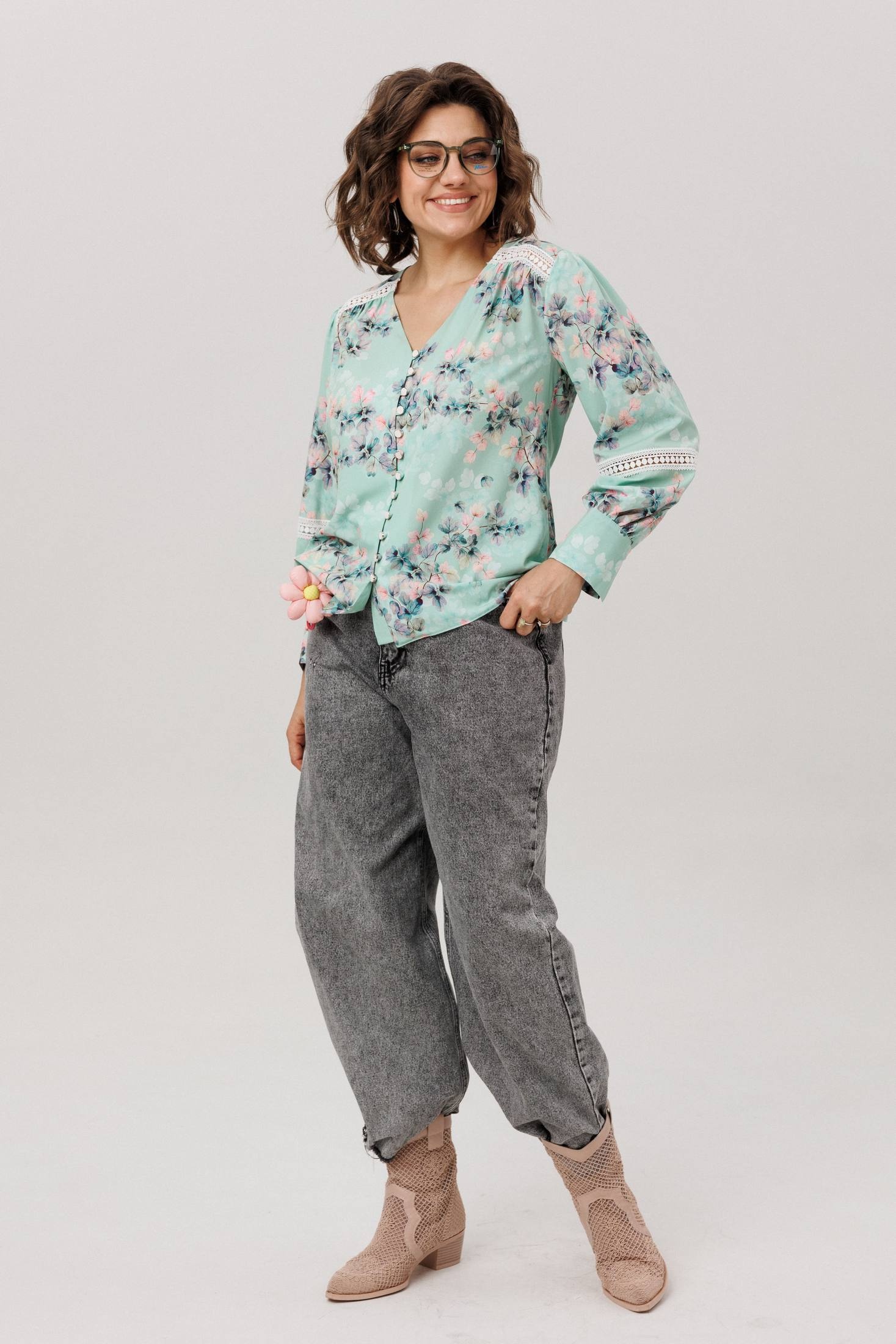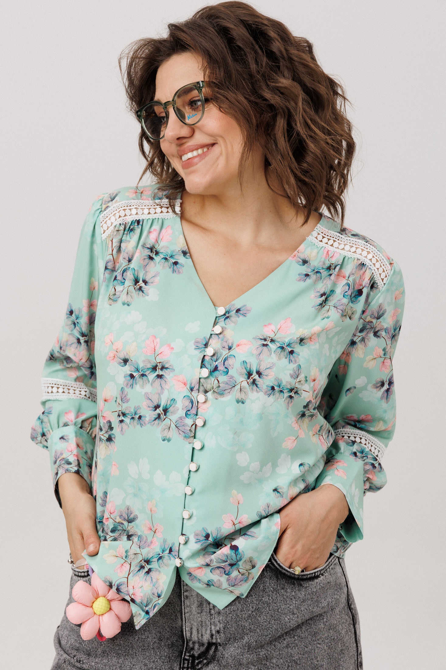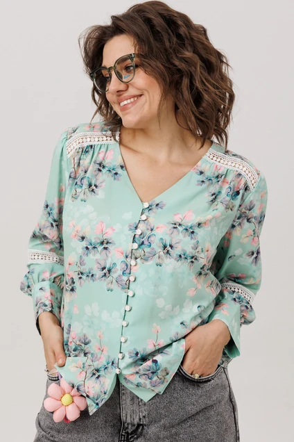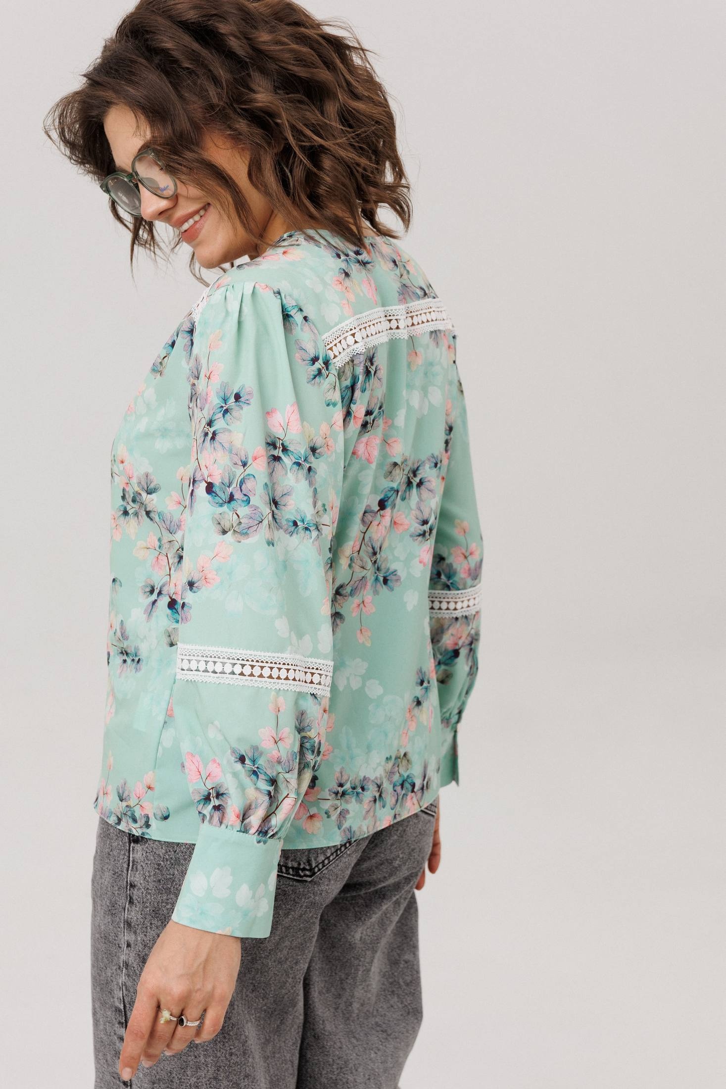 Прямой силуэт из легкой ниагары цвета «нежная мятность» мягко струится, даря ощущение свежести и свободы. Романтичные кокетки и нежные кружевные вставки на спинке и переда создают тонкий акцент, подчеркивая изящный v-образный вырез. Застежка на пуговицы с навесными петельками добавляет отсылку к винтажной простоте. Втачной рукав заканчивается манжетой, украшенной кружевной каймой, что завершает образ продуманной деталью. Сдержанный принт и воздушные текстуры делают эту блузу идеальной основой, способной наполнить спокойной элегантностью любой день.
