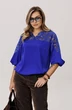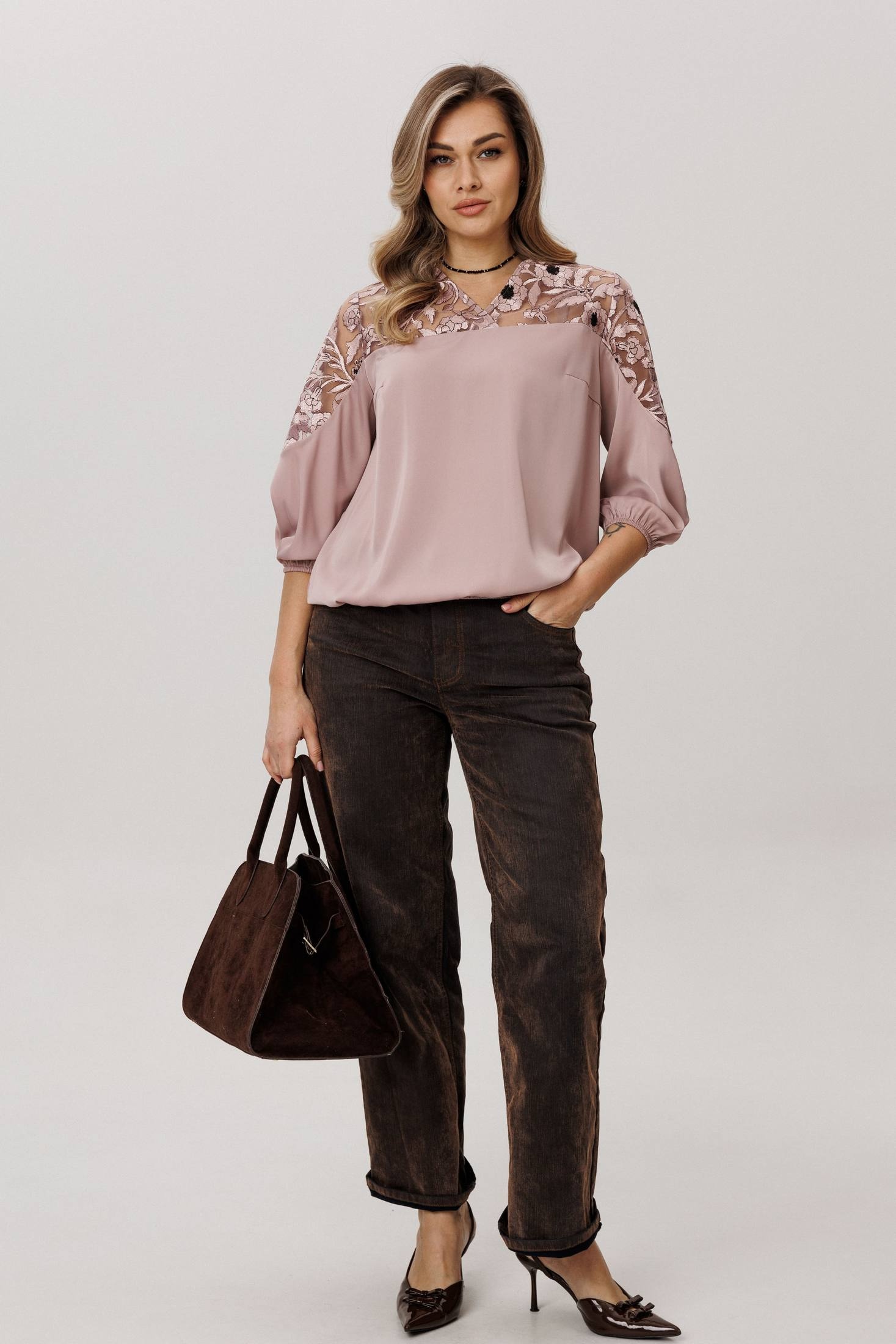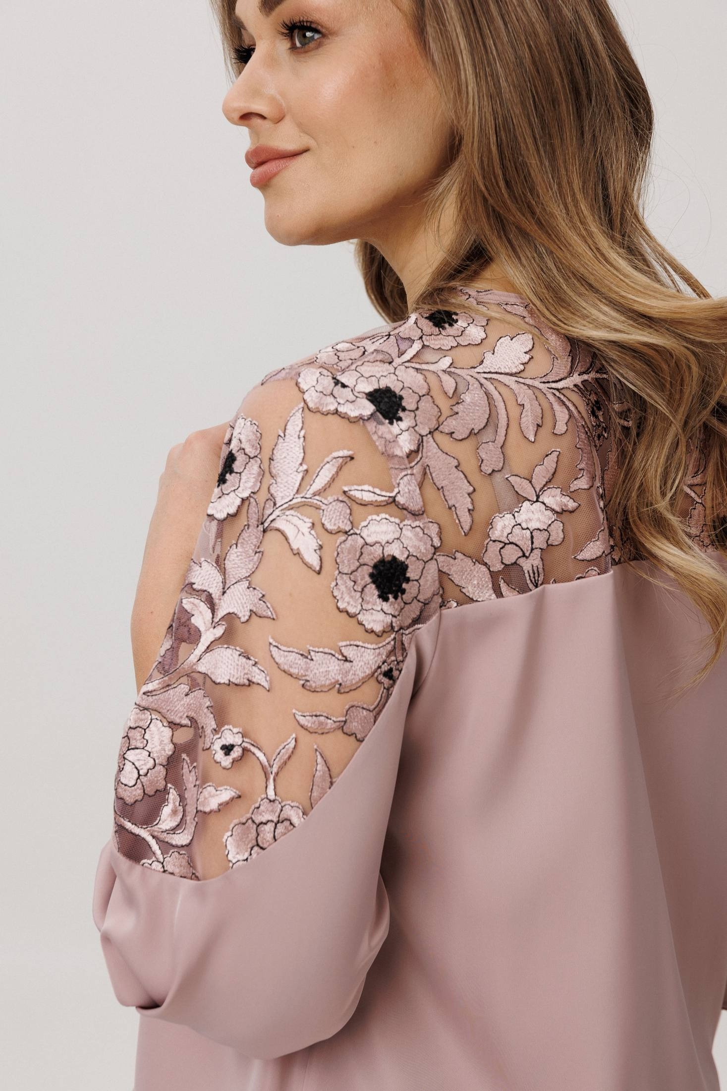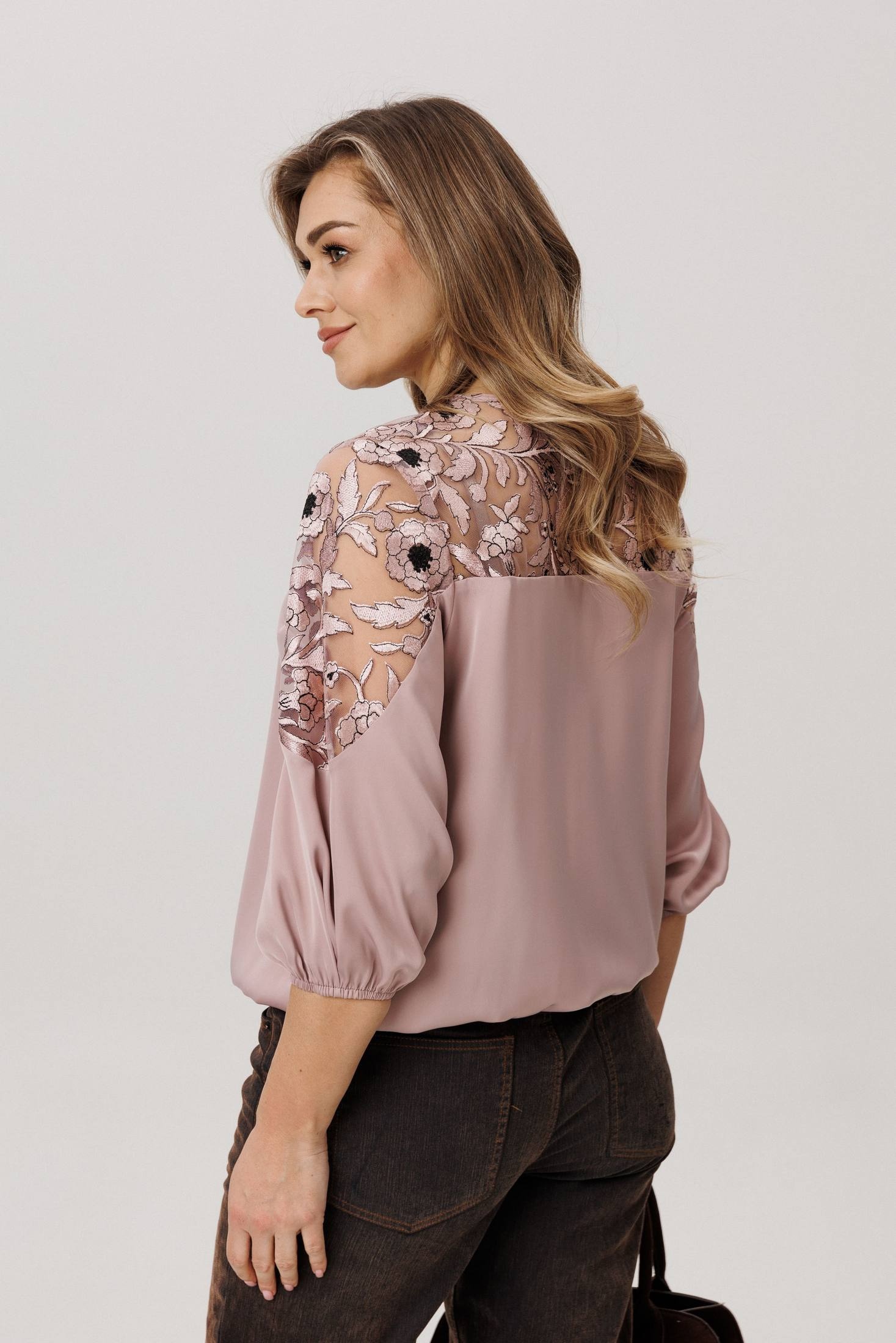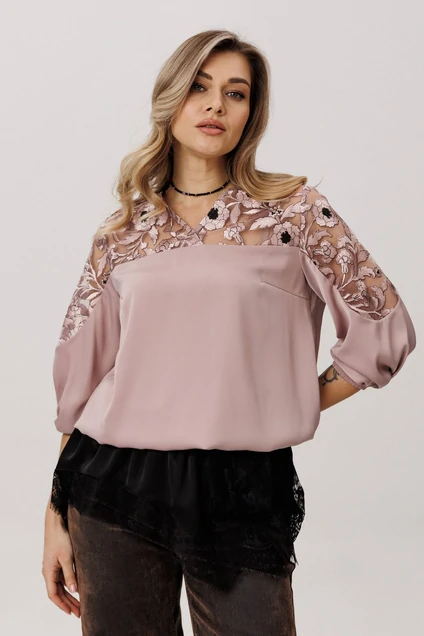 Верхняя часть, словно лёгкое кружевное облако с изысканными кокетками на полочке, спинке и изящными вставками на рукавах, переходит в благородный гладкий атлас, мерцающий приглушённым блеском. Рукава три четверти, собранные у низа на тонкую резинку, и такой же аккуратный низ самой блузы создают мягкие, едва уловимые волны, добавляя образу воздушности и динамики.
