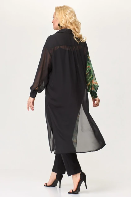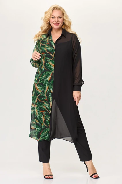 Рубашка свободного силуэта, прямого кроя, удлиненная. Воротник рубашечный классический. Центральная планка, петли-пуговицы. На спинке кокетка,от кокетки по центру спинки маленькая сборка. Спущенная линия плеча, низ рукава заканчивается притачной манжетой, застегивается на 2 петли и пуговицы. По бокам разрезы. Длина плеча-23см, длина рукава+манжет-57см, длина по спинке-120см. Длина разреза 51см. Ткань шифон.
