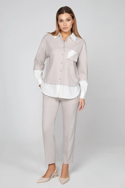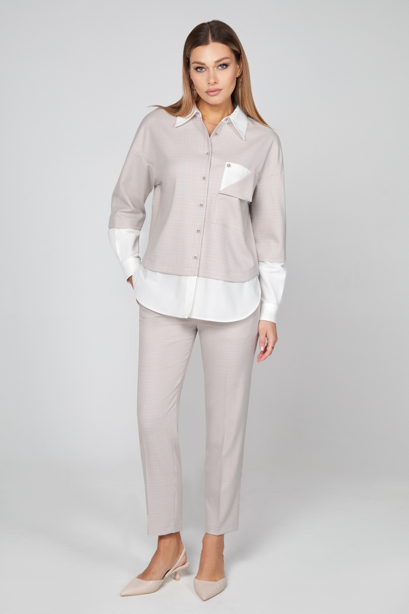 Эта стильная блузка свободного кроя, с оригинальной отделкой из однотонной хлопковой ткани гармонично дополняющей дизайн основной ткани с классическим узором «гусиная лапка»,позволит вам создать актуальный и комфортный образ. Модель с отложным воротником-стойкой, застёжкой на петли и пуговицы, со спущенной линией плеча с притачными рукавами с манжетами и фигурной линией низа разной длины переда и спинки, . Интересный карман по переду становится ключевой фишкой дизайна. В пару к блузке можно подобрать брюки из той же линейки.