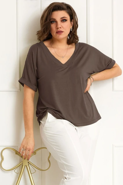 Стильная блуза полуприлегающего силуэта. Прекрасный вариант для носки в жаркую погоду, т.к. выполнена из лёгкого трикотажа с содержанием вискозы. Блуза имеет укороченный цельнокроёный рукав с лёгким эффектом «летучей мыши», низ которого, обработан обтачкой с подгибкой на лицевую сторону. По передней части V-образный вырез, обработанный притачной обтачкой. Спинка изделия длиннее полочки и имеет форму полукруга по низу. длина по центру спинки: 61 см