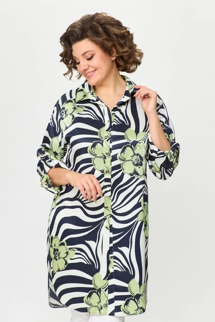 Рубашка свободного силуэта, удлиненная с центральной застежкой по пуговицы, воротник рубашечный с отрезной стойкой, нижняя часть спинки по центру со складкой. Рукава втачные двухшовные с манжетом по низу. Манжет застегивается на петли пуговицы.