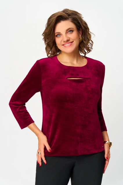 Элегантная бархатная блузка насыщенного бордового цвета. Модель с длинными рукавами и округлым вырезом горловины обладает минималистичным дизайном, дополненным небольшим прорезным декоративным элементом на груди. Длина изделия составляет 58 см, что делает её универсальной для сочетания как с брюками, так и с юбками. Подходит для создания как деловых, так и более расслабленных образов.
