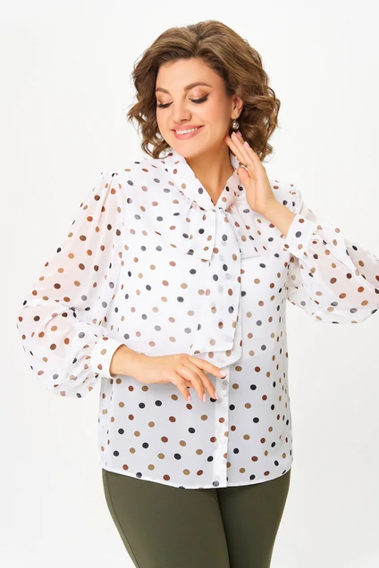 Элегантный комплект, состоящий из блузы и топа, выполнен в классическом белом цвете с привлекательным гороховым принтом. Блуза с длинными рукавами (65 см), оснащенная манжетами на пуговицах, добавляет изысканный акцент. Изделие имеет стандартную длину 67 см, что делает его универсальным выбором для различных случаев. Лацканы воротника украшены необычной деталью, придавая образу особый шарм. Этот комплект идеально подходит для создания как делового, так и повседневного образа.