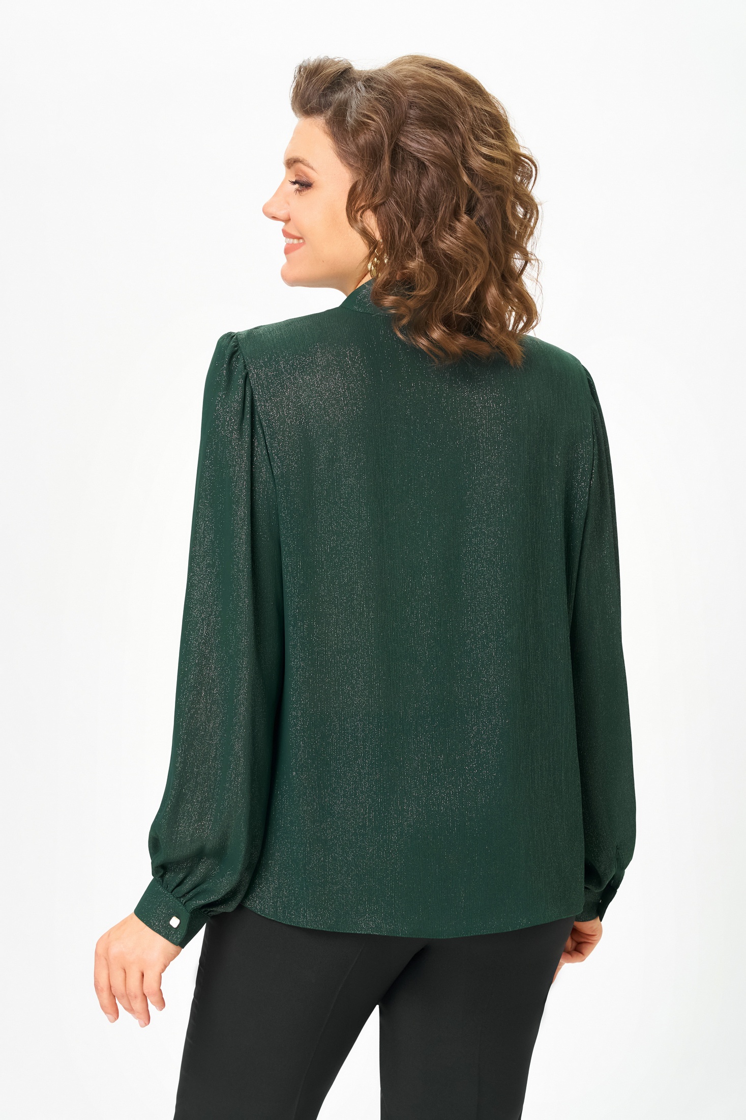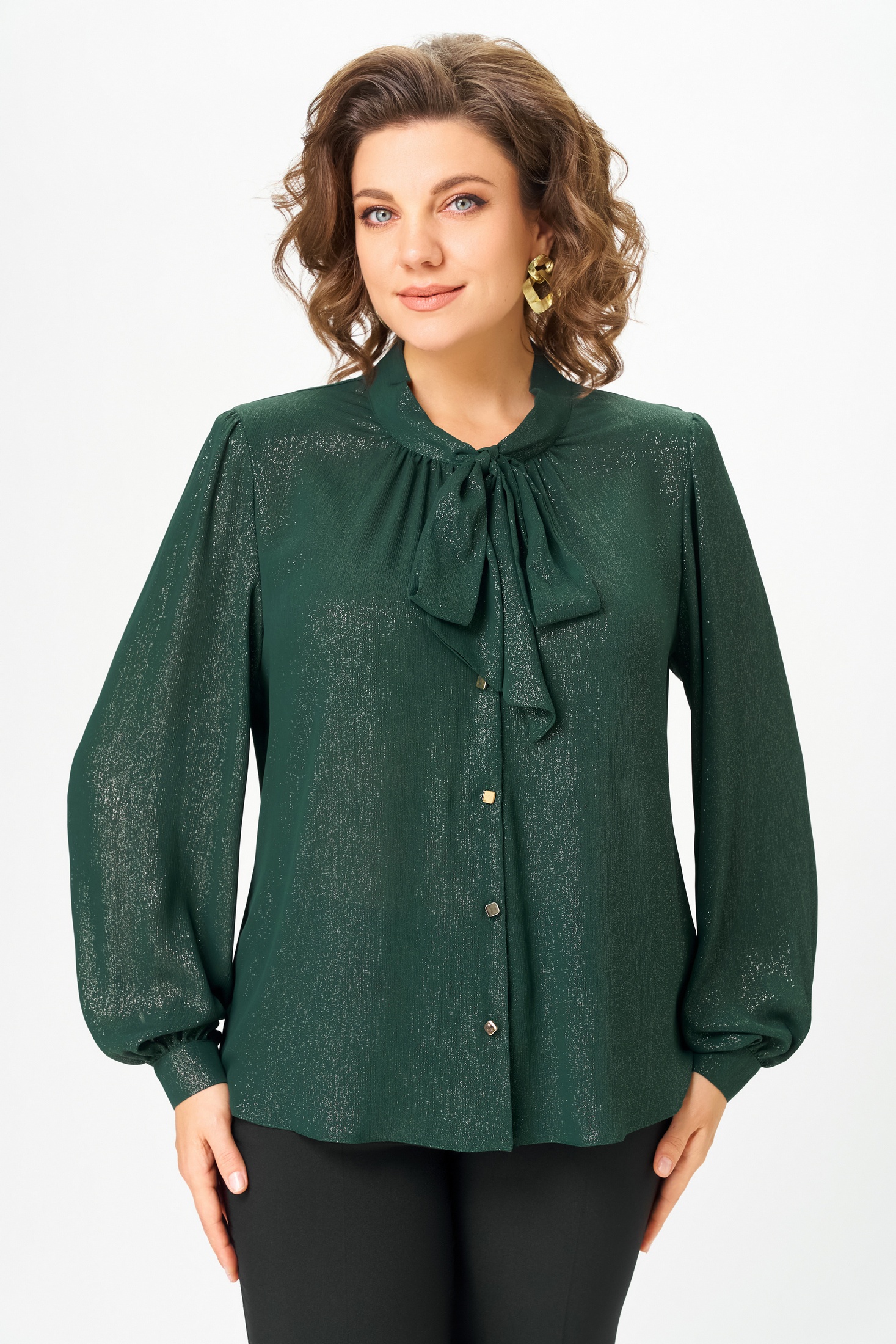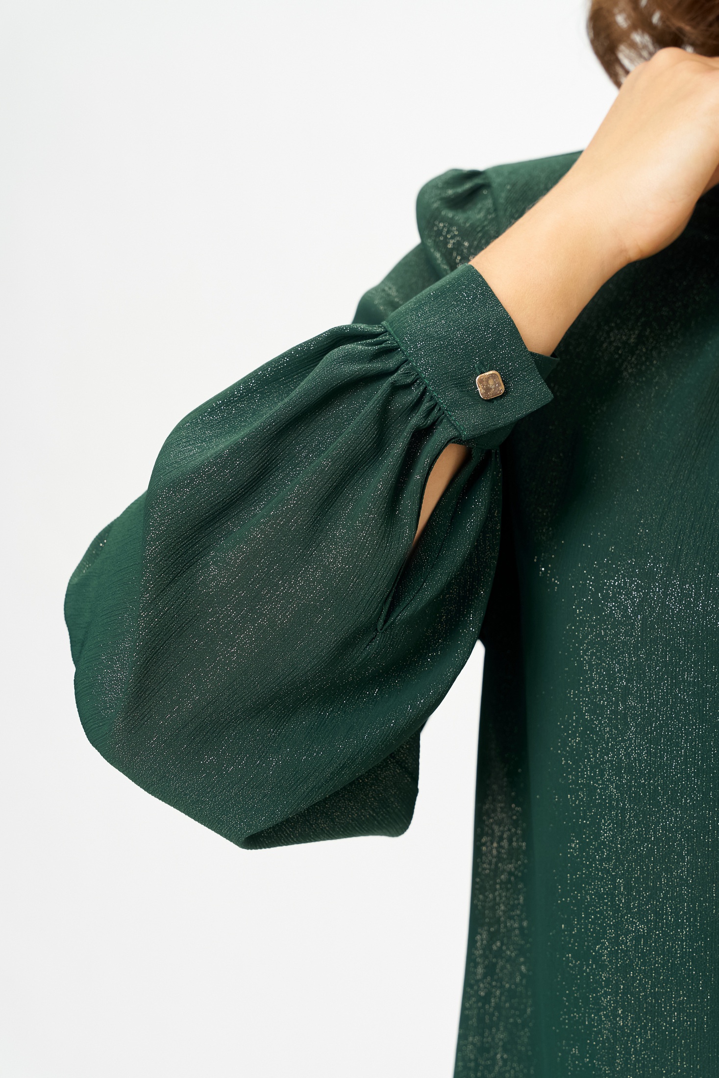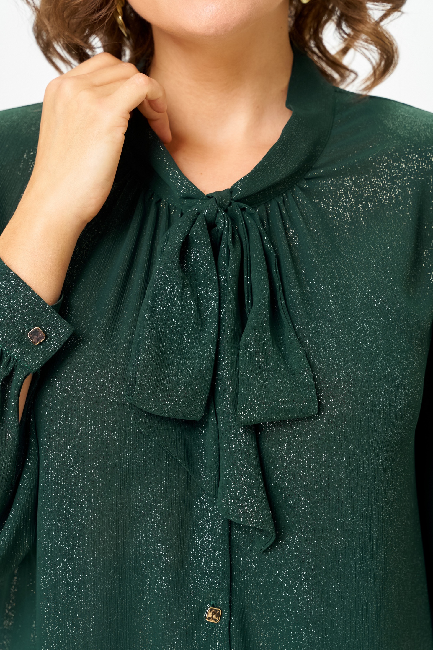 Элегантная женская блузка темно-зеленого цвета с искрящимся эффектом, идеальна для создания как делового, так и вечернего образа. Модель с длинными, слегка объемными рукавами с манжетами на пуговицах. Особенностью дизайна является аккуратный бант у горловины и вертикальная планка с пуговицами спереди, что добавляет блузке особого шика. Длина изделия 67 см, длина рукава 64 см.