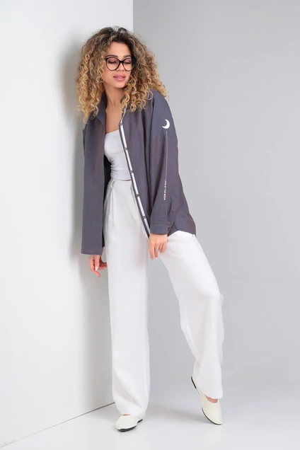 Блузка свободного силуэта, удлиненная, из натуральной льняной ткани. Перед на застежке петли-пуговицы. Воротник на стойке. Спинка разрезная с декоративными элементами. Рукав втачной на спущенной пройме, длинный с манжетой на застежку. Длина 73 см, рукав от горловины 71 см. Длина по спинке 73 см, рукав 71 см, длина по полочке 63 см.