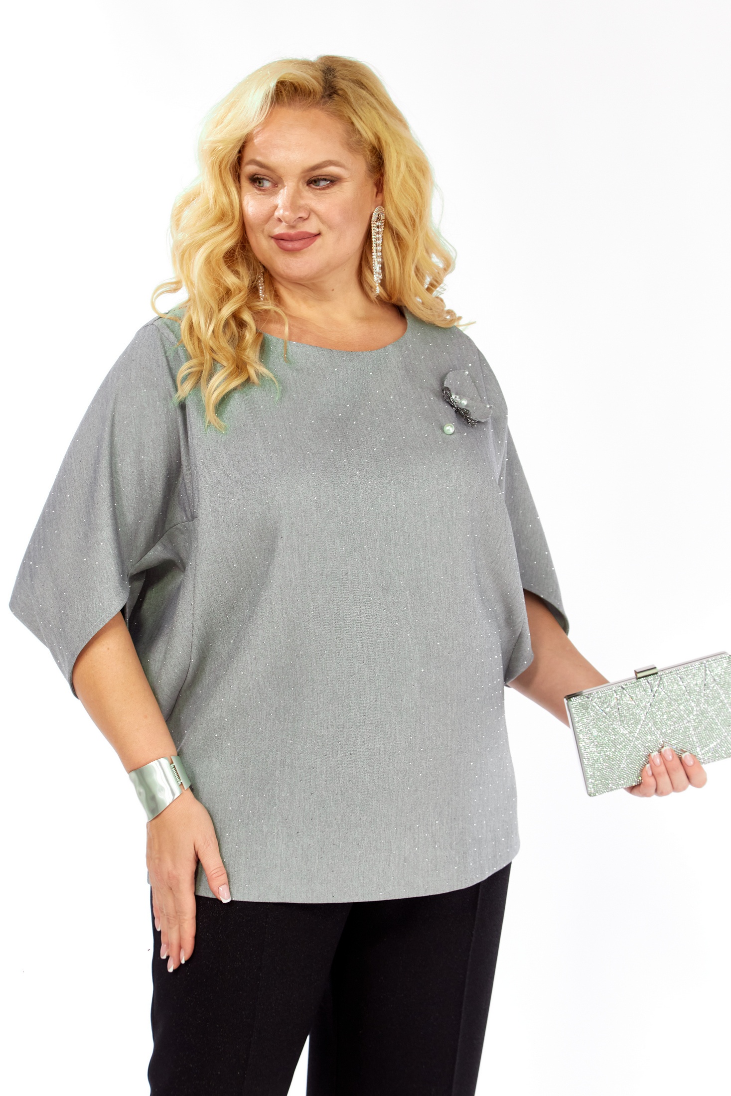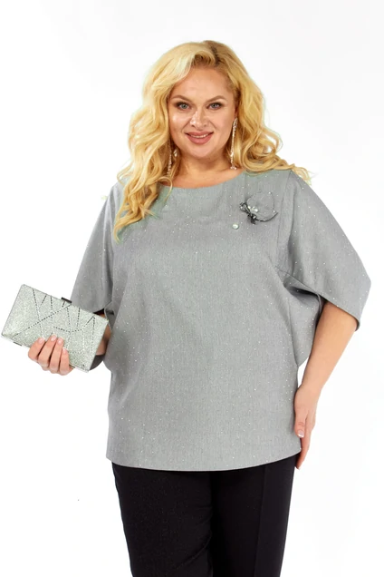 Уникальная блуза, сочетает в себе изысканный дизайн и комфорт. Прекрасно подойдет для праздничных мероприятий. Блуза полуприлегающего кроя из ткани на поверхности которой присутствует легкое элегантное мерцание кристаллов. Горловина аккуратной округлой формы. Эффектные рукава с фантазийным решением — усиливают модный акцент и придают дополнительный шарм. Декоративным элементом является съемная дизайнерская брошь.
