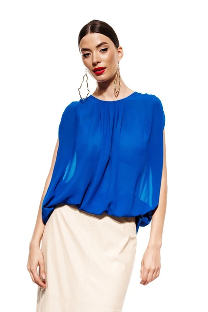 Блузка женская прямого силуэта, длиной до середины линии бедра, из шифонового полотна, без рукавов. По переду в области горловины и по плечевому шву заложены складки. Низ спинки, горловина и застежка “капля” на одну петлю пуговицу, обработаны окантовкой, а проймы бейкой. По низу переда есть резинка. Длина 65 см.