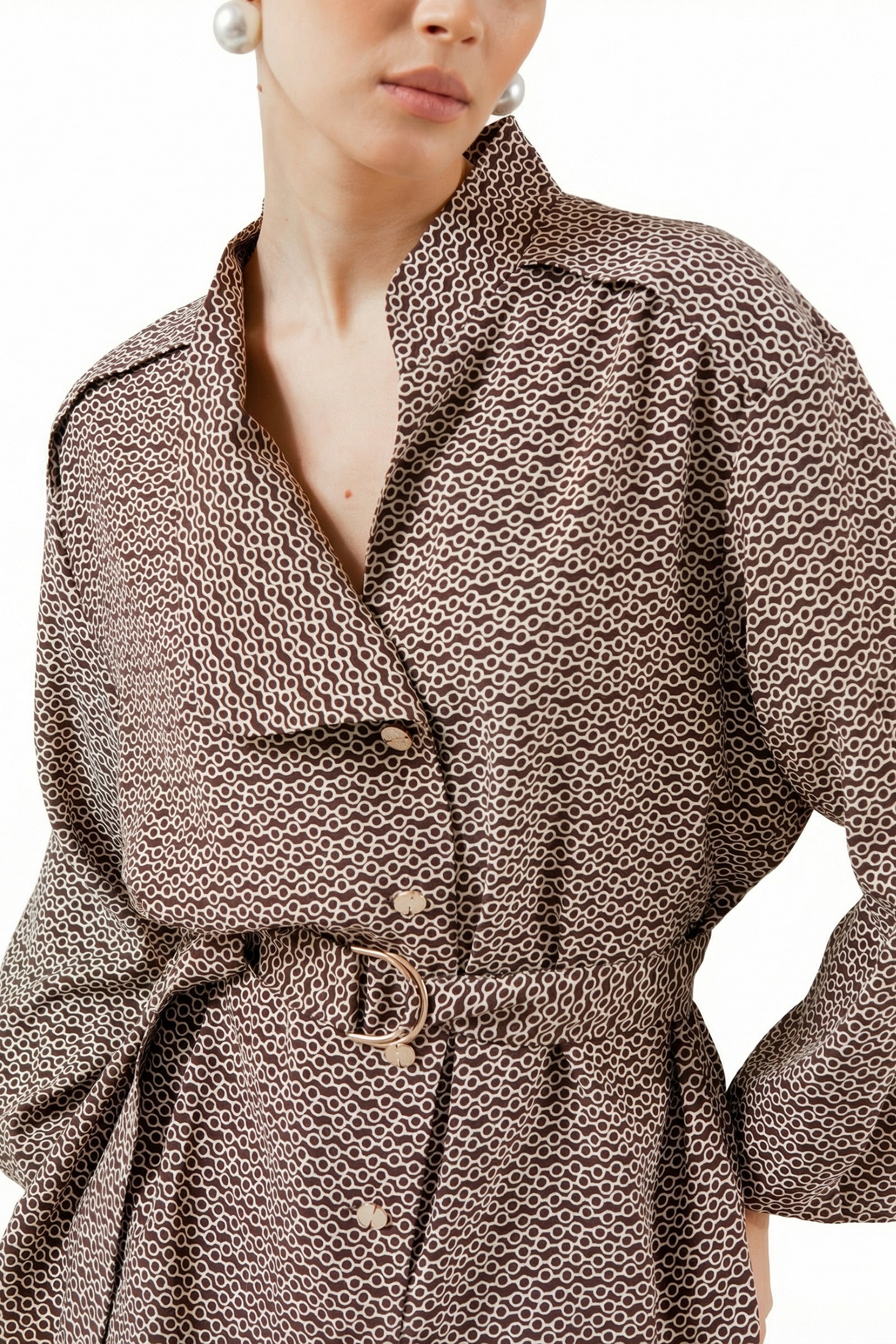 Блуза прямого силуэта, удлиненная, с застежкой впереди на петли и пуговицы.