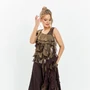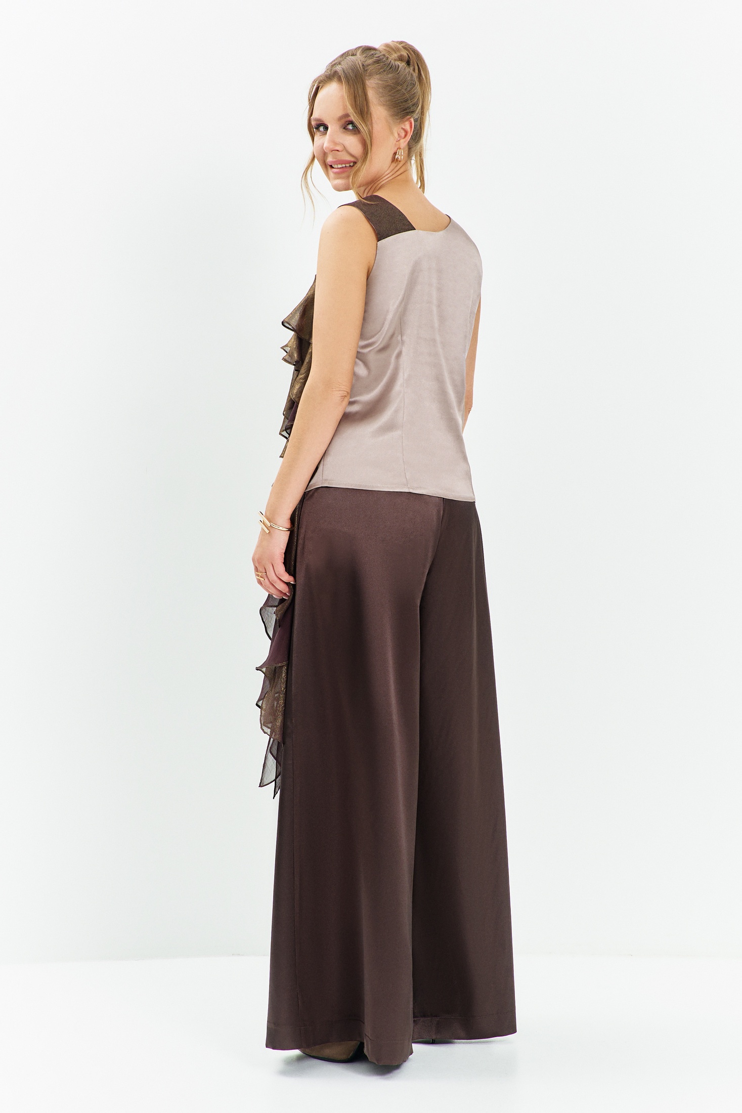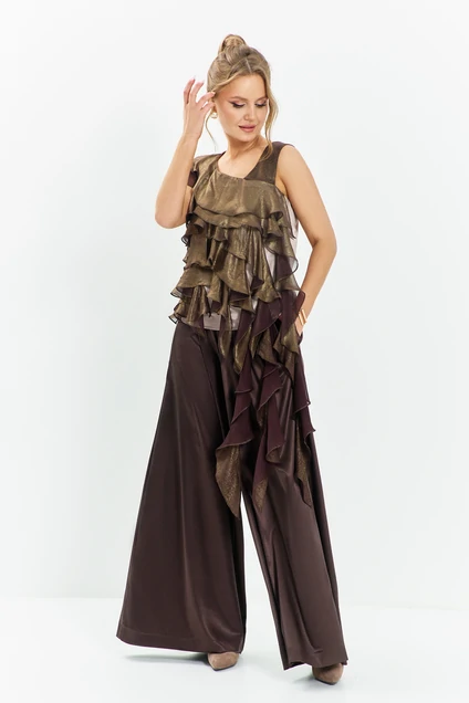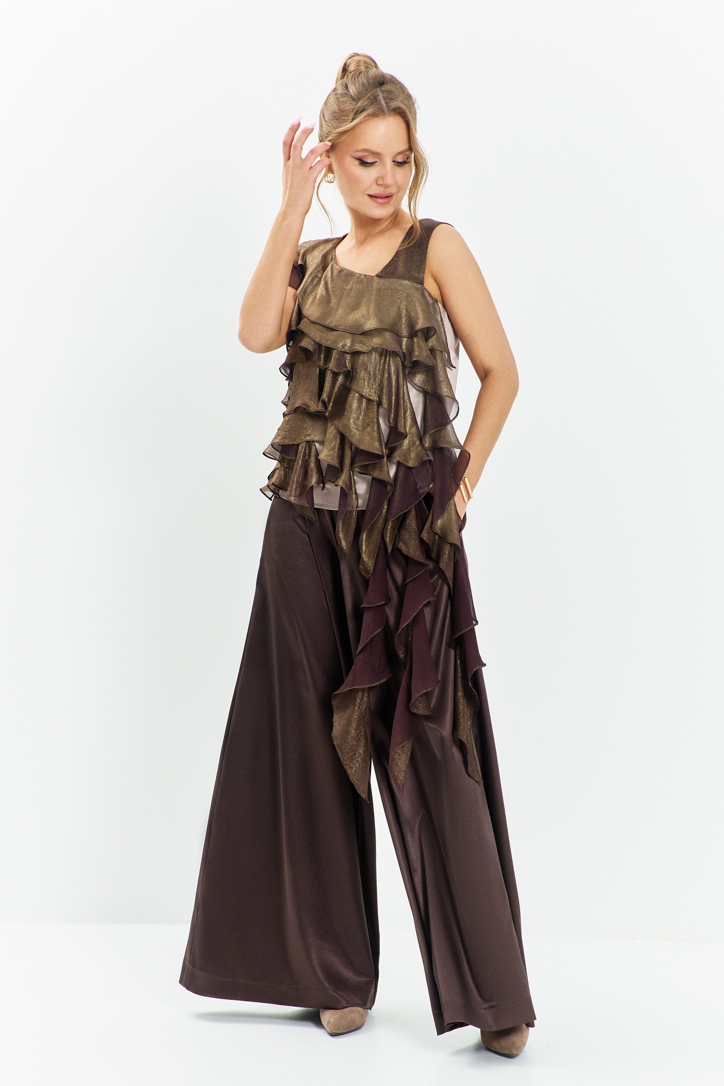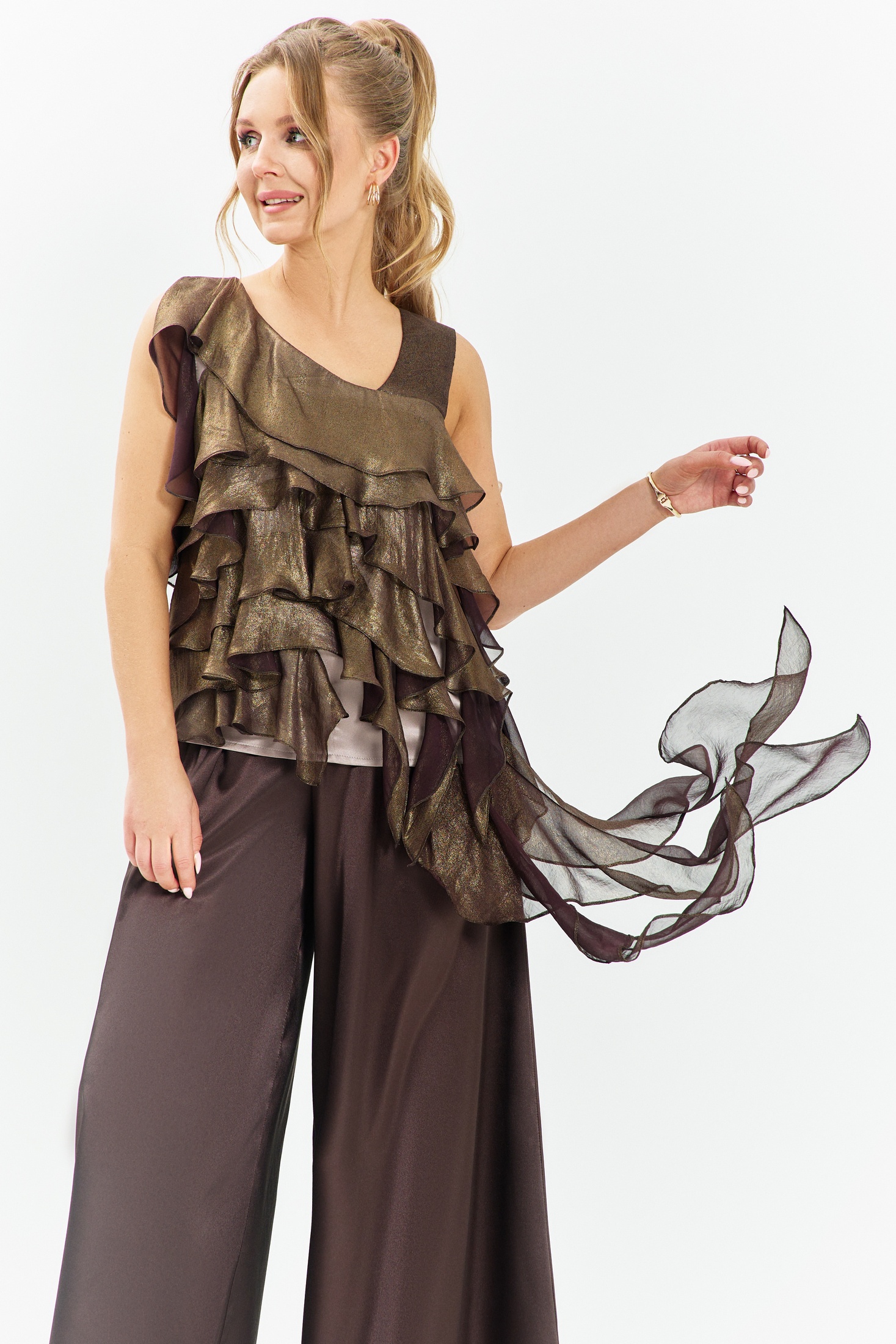 Эффектная блуза без рукавов, выполненная из шифона коричневого оттенка с легким напылением, добавит изысканности вашему образу. Эта модель оснащена асимметричной горловиной, а также настрочными воланами, расположенными асимметрично с удлинением на одну сторону, что придает динамику и необычный силуэт. На спинке изделия предусмотрены таллиевые выточки для идеальной посадки. Эта блуза идеально подходит для создания как праздничного, так и элегантного повседневного ансамбля.