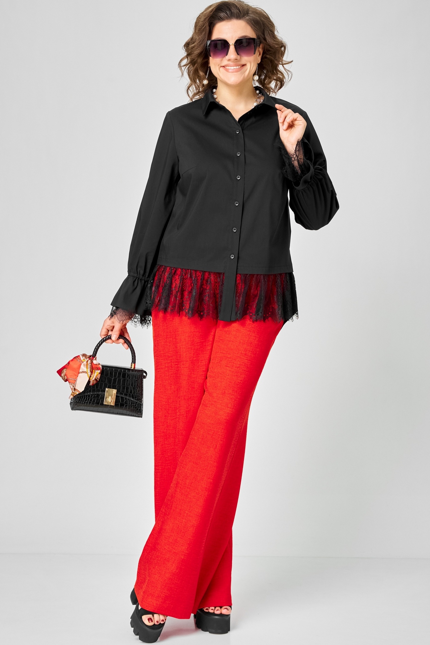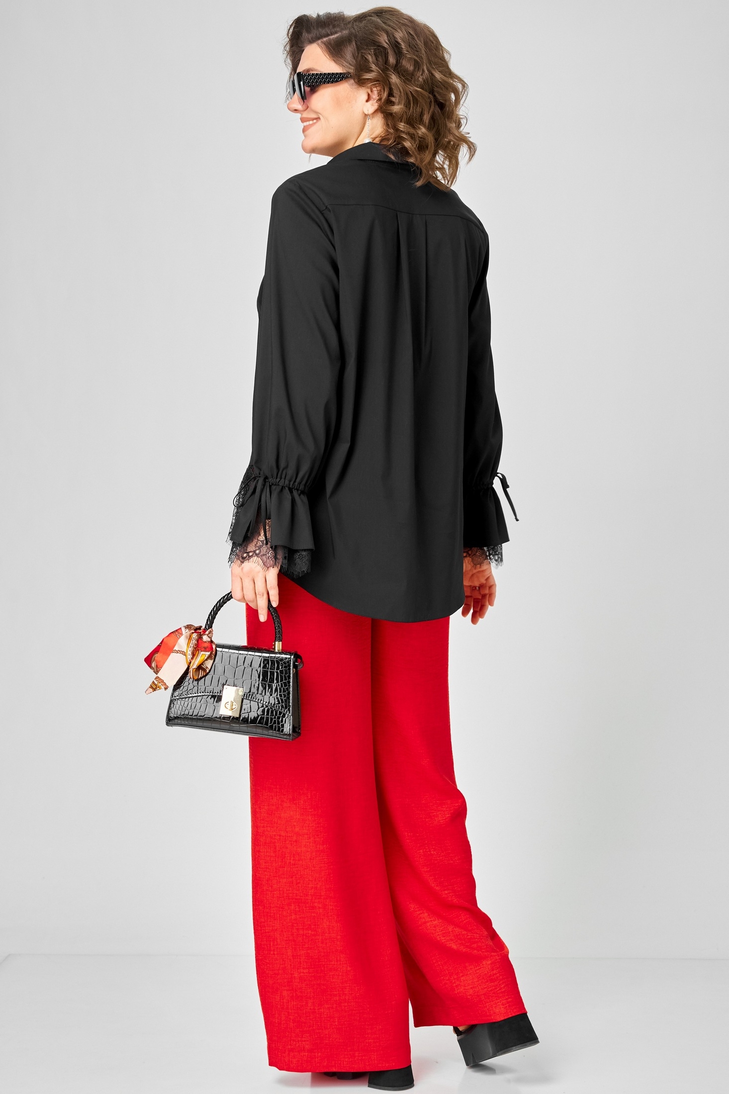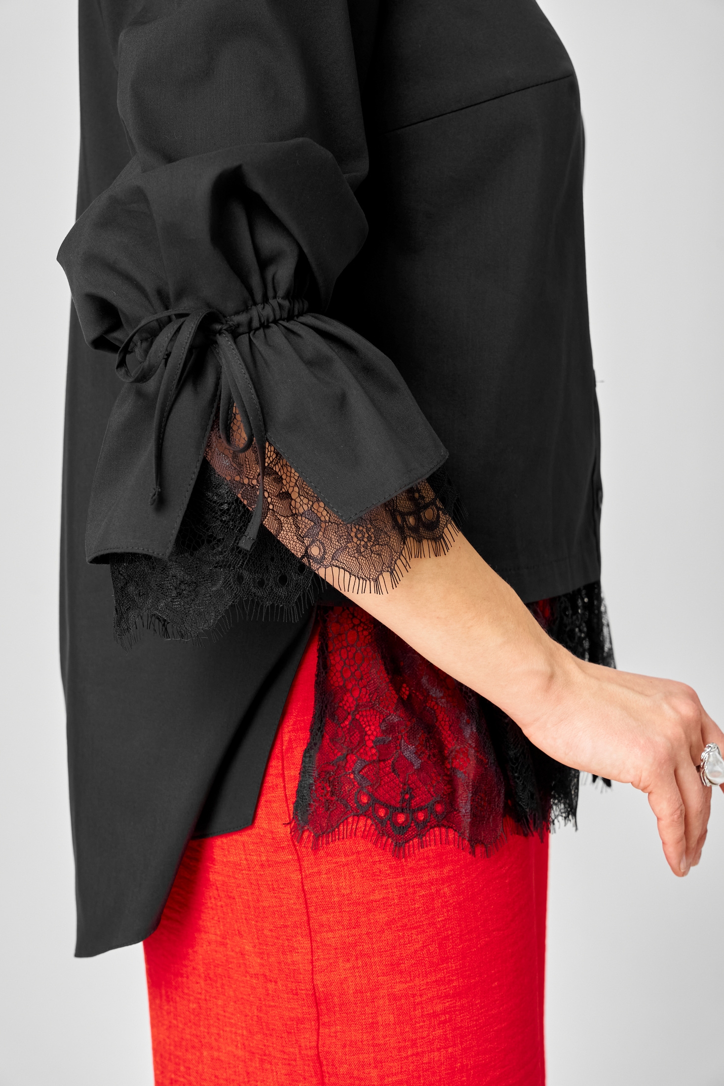 Блузка 5002 черный с кружевом EVA GRANT — это модная и стильная деталь вашего гардероба. Коллекция бренда EVA GRANT предлагает эту блузку из хлопка, дополненную изысканным итальянским кружевом, что делает её идеальной для нарядных повседневных образов. Прямой силуэт и воротник на стойке добавляют классической строгости. Застежка на пуговицы обеспечивает удобство, а декоративная манжета с кружевом и кулисой позволяет регулировать длину рукава, придавая блузке функциональность. Разрезы по бокам и встречная складка на спинке создают комфортную посадку, скрывая недостатки фигуры. Черный цвет делает блузку универсальной для любого сезона и случая.