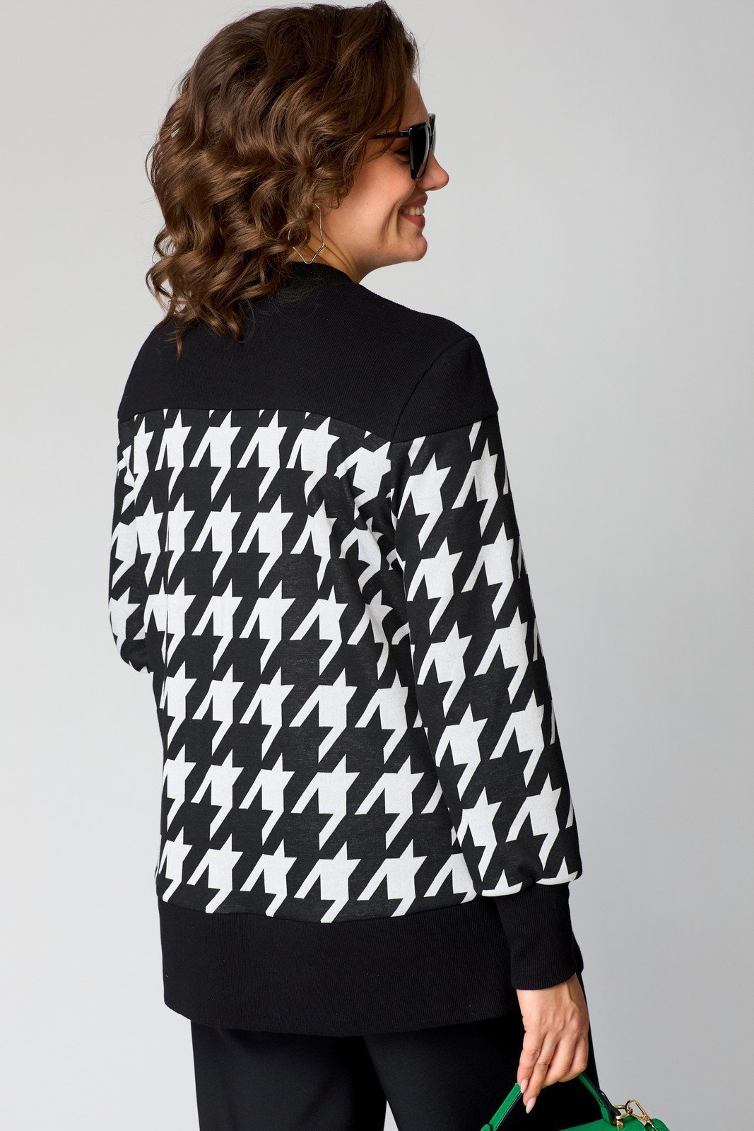 Блуза женская повседневная прямого силуэта выполнена из трикотажного полотна двух дизайнов. Вырез горловины невысокая мягкая стойка. Рукав втачной по низ на притачной манжете. В боковых швах обработаны небольшие разрезы. Декором служит дизайн основной ткани.