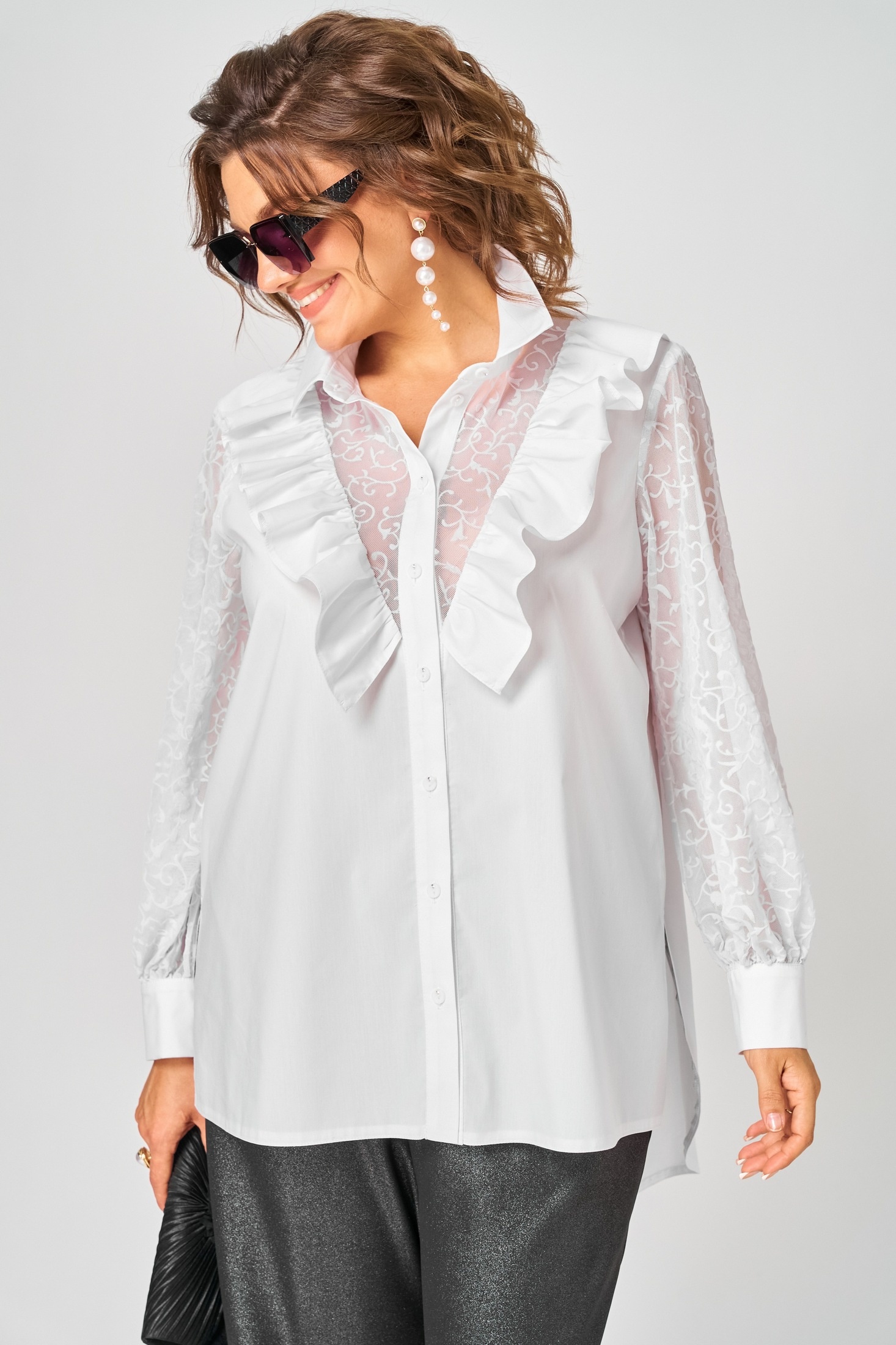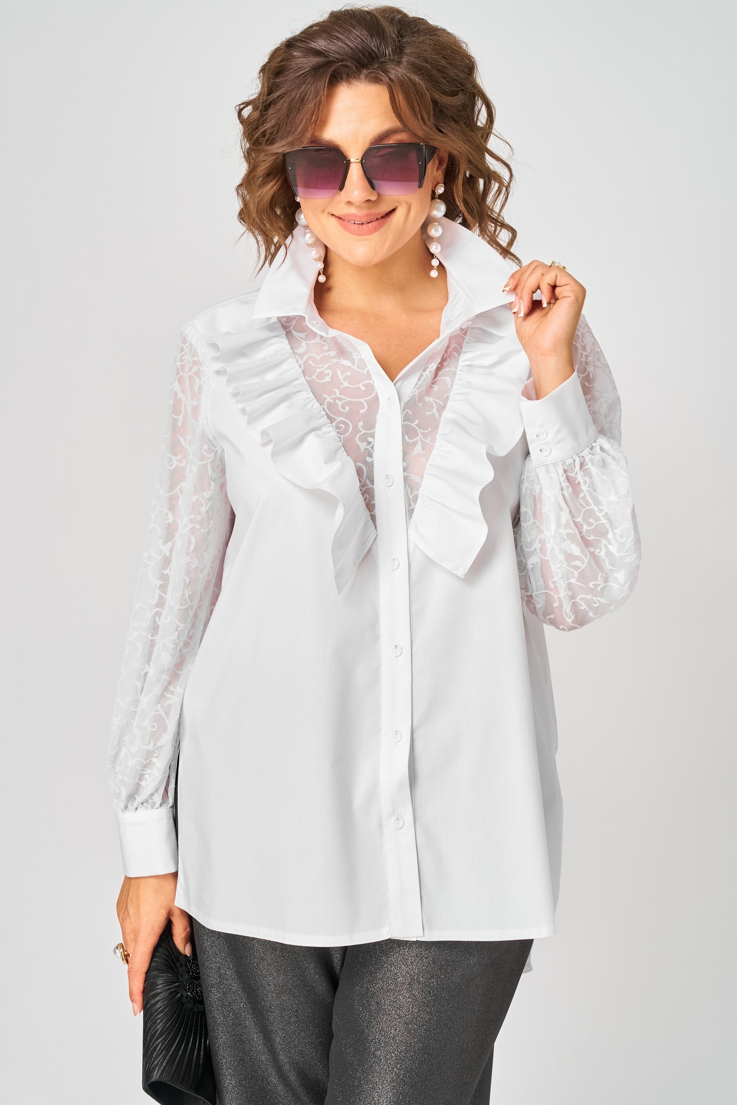 Блуза шикарная женская элегантная нарядная свободного силуэта выполнена из хлопка в сочетании с гипюром (сеткой с флоком). Вырез горловины воротник на стойке рубашечного типа, рукав втачной из гипюра (сетки) по низу на сборке и притачной манжете.Застежка доверху на обметанные петли и пуговицы. По полочке фигурные вставки из гипюра (сетки) с притачной рюшей с двух сторон. Рюша входит в плечо. В боковых швах обработаны разрезы. Низ блузы фигурный. Декором блузы служит дизайн гипюра (сетки) и рюши со сборкой.