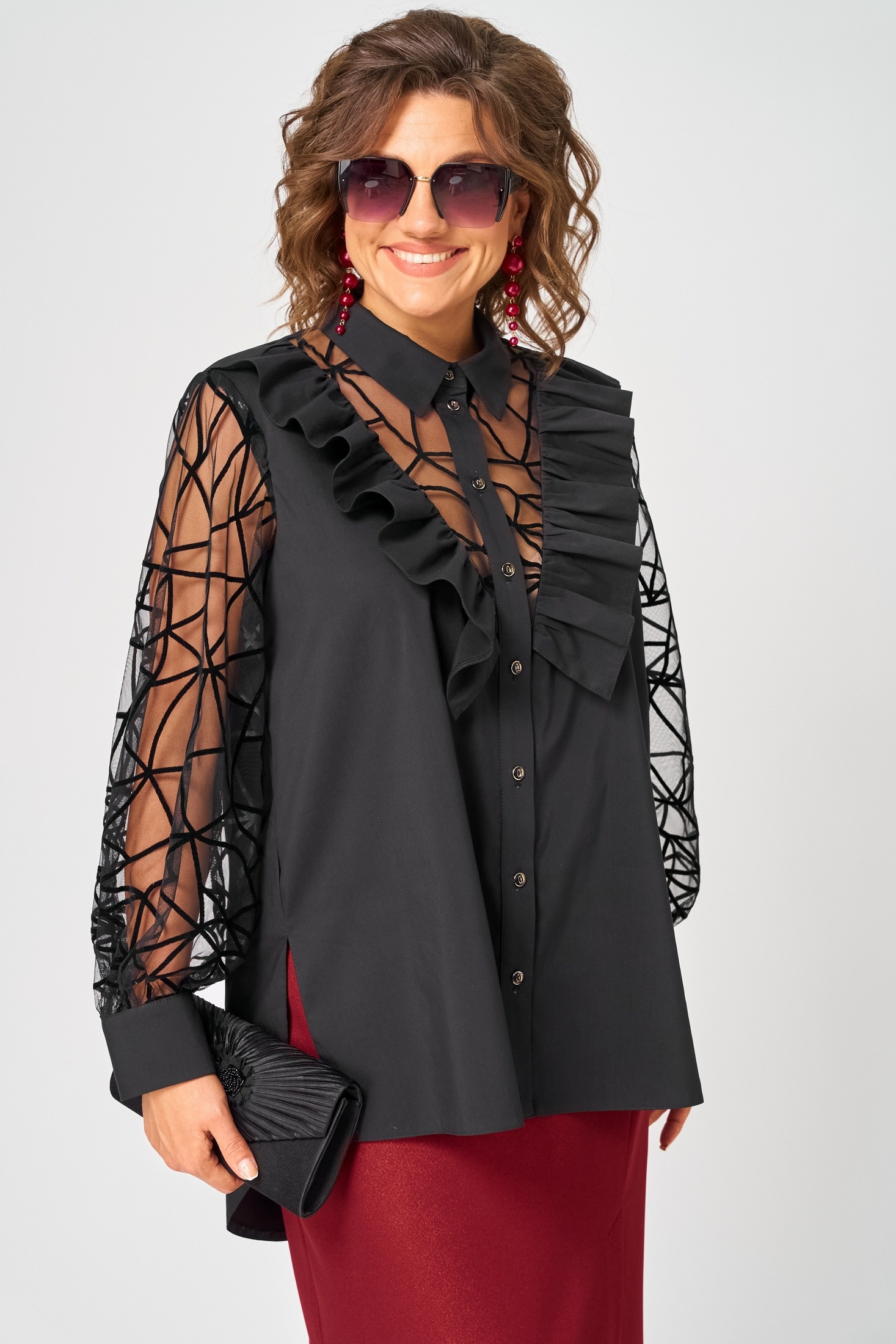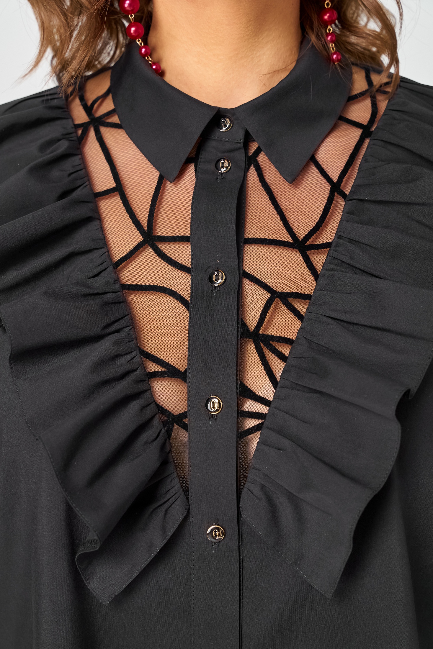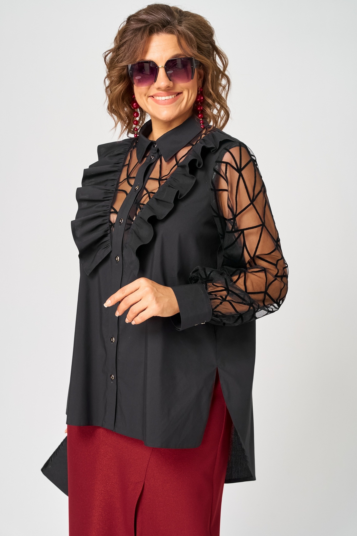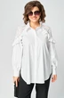 Блуза шикарная женская элегантная нарядная свободного силуэта выполнена из хлопка в сочетании с гипюром (сеткой с флоком). Вырез горловины воротник на стойке рубашечного типа, рукав втачной из гипюра (сетки) по низу на сборке и притачной манжете.Застежка доверху на обметанные петли и пуговицы. По полочке фигурные вставки из гипюра (сетки) с притачной рюшей с двух сторон. Рюша входит в плечо. В боковых швах обработаны разрезы. Низ блузы фигурный. Декором блузы служит дизайн гипюра (сетки) и рюши со сборкой.