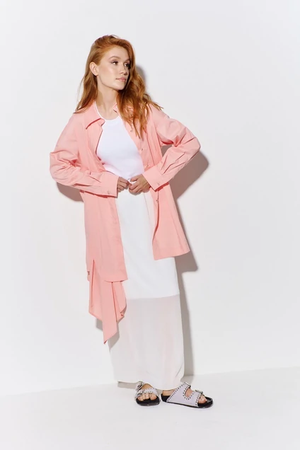 Рубашка-ассиметрия оверсайз. Характеристики: свободный силуэт, выполнена из рубашечной ткани в персиковом цвете, центральная застежка на петли и пуговицы, по стойке воротника и манжетам декоративные пуговицы, по низу полочки обработан декоративный элемент, переходящий на спинку, по спинке отрезная кокетка и складка, низ рукава обработан манжетой на петлю и пуговицу. Длина рубашки по переду 85 см, длина рукава 53,5 см.