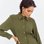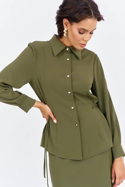 Рубашка приталенного кроя с декоративными завязками по талии. Характеристики: выполнена из плательной ткани в цвете хаки, по талии обработаны декоративные завязки, центральная застежка на петли и пуговицы, по низу рукавов манжеты с защипами. Длина рубашки по переду 68,5 см, длина рукава 60,5 см.