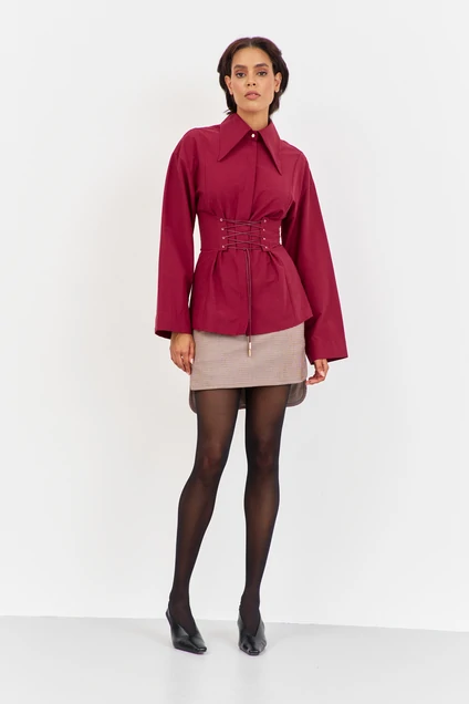 Блузка приталенного силуэта с декоративной шнуровкой по переду и спинке. Характеристики: выполнена из блузочной ткани в цвете марсала, центральная застежка на петли и пуговицы, по переду и спинке декоративная шнуровка, воротник рубашечного типа, спущенное плечо. Длина рубашки по переду 71 см, длина рукава 57 см.