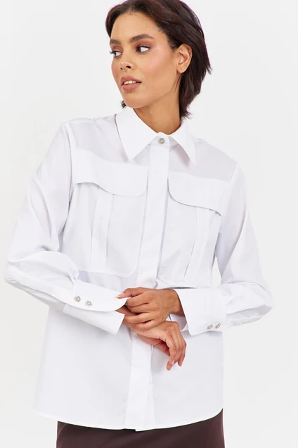 Рубашка приталенного кроя с декоративными карманами по переду. Характеристики: выполнена из блузочной ткани в белом цвете, по переду обработаны декоративные карманы, центральная застежка на петли и пуговицы, по низу рукавов манжеты с декоративными углами. Длина рубашки по переду 68,5 см, длина рукава 60,5 см.