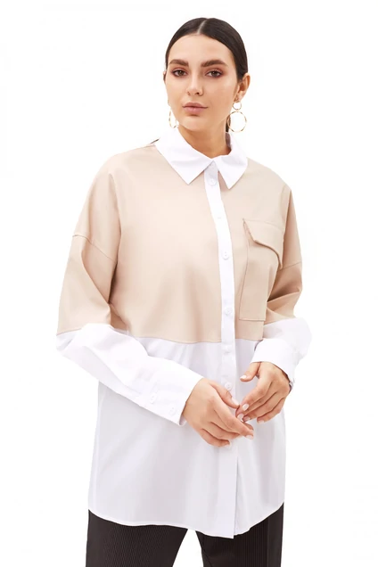Рубашка свободного силуэта выполнена из двух видов ткани: белый рубашечный поплин и ЭКО-кожа. Застежка по переду на петли ипуговицы, отложной воротник, рукава на манжетах.