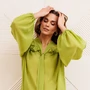 Блузка свободного силуэта из струящейся шифоновой ткани. Перед и спинка с кокеткой и сборкой. Рукав спущенный свободный с резинкой понизу. Вдоль линии кокетки и рукава вставлена рюша. Горловина V-образной формы с воротником стойкой переходящей в бант. Длина блузки - 67 см, длина рукава - 60 см.