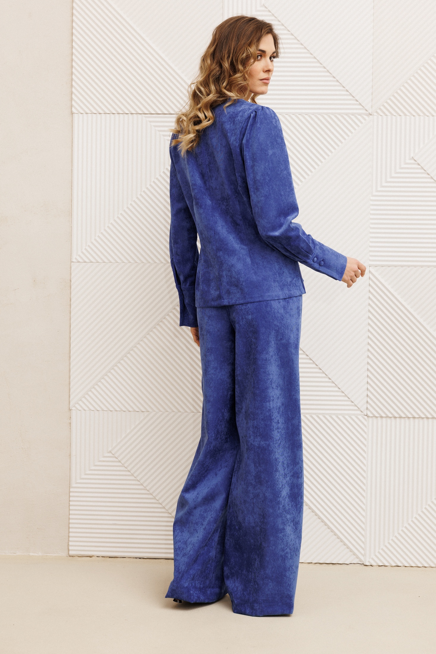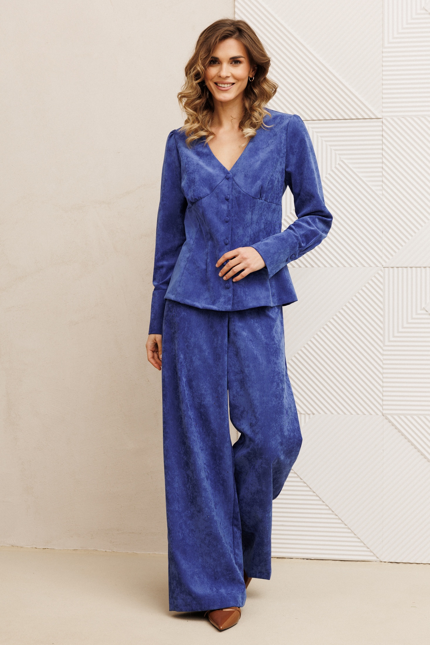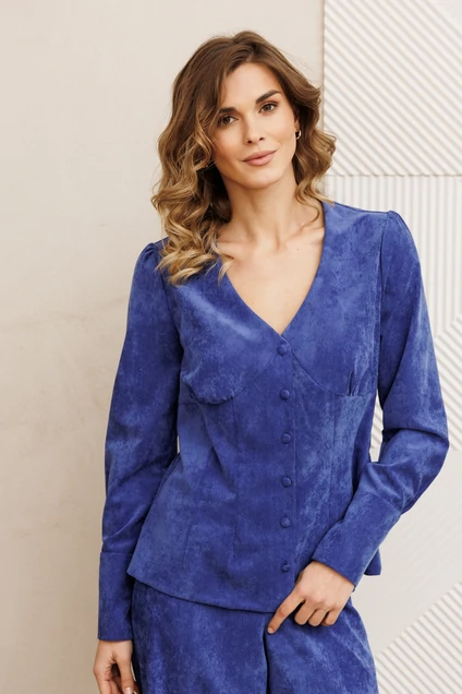 Блузка оригинальная приталенного силуэта из вельветовой ткани. Перед с подрезом под грудью, сборкой в районе груди и талиевыми вытачками. Затсежка на петли и пуговицы. Горловина V-образной формы. Спинка со средним швом и талиевыми вытачками. Рукав втачной со сборкой по окату и с манжетой по низу. Манжета высокая с двумя петлями и пуговицами. Длина блузки - 63 см, длина рукава блузки - 64 см.