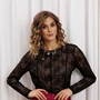 Блузка из элегантной черной кружевной сетки, создающая изысканный и женственный образ. Модель приталенного силуэта, дополненная тонкими рельефами и средним швом как на передней, так и на задней части. Романтический цветочный принт добавляет блузке шарма. Втачные длинные рукава и телесная подкладка на передней и задней части обеспечивают комфорт и не просвечивают. Изделие идеально подходит для роста 164-170 см, обеспечивая идеальную посадку и прикрывая необходимые участки. Эта блузка станет изысканным дополнением к вашему гардеробу, подчеркивая утонченный вкус и женственность.