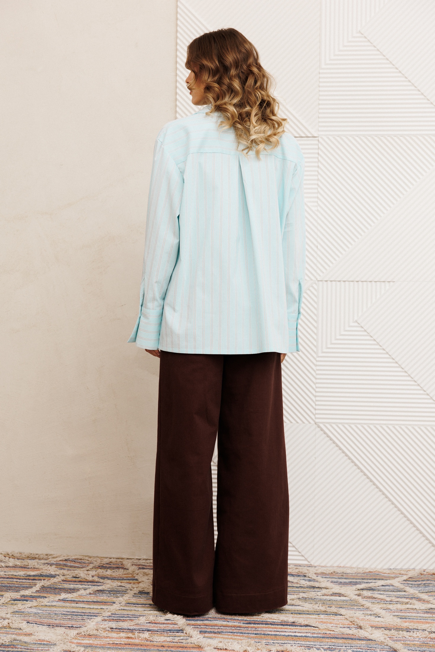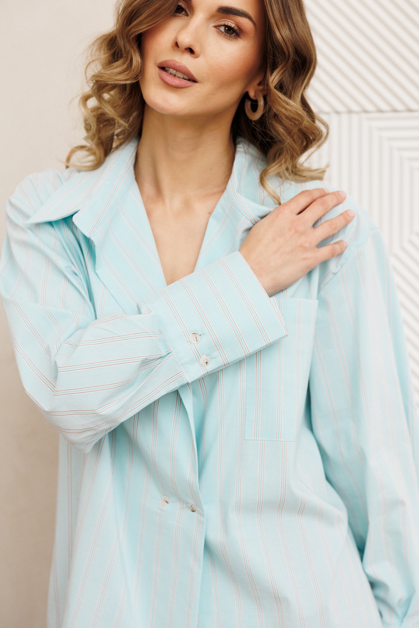 Рубашка свободного силуэта из хлопковой ткани в полоску. Перед с двубортной застежкой и карманом в районе груди. Воротник со стойкой. Спинка с кокеткой и складкой. Рукав втачной рубашечный с высокой манжетой на 2 петли и пуговицы. Длина рубашки - 70 см. Длина рукава - 60 см.