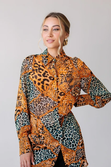 Блузка женская повседневная прямого кроя, воротник рубашечного типа, длинный рукав с манжетой. Шикарная полупрозрачная женская блузка свободного кроя - прекрасное дополнение для завершения любых образов на каждый день либо на мероприятие. Идеально будет сочетаться с кроп-топом, боди, топом на тонких или широких бретелях.