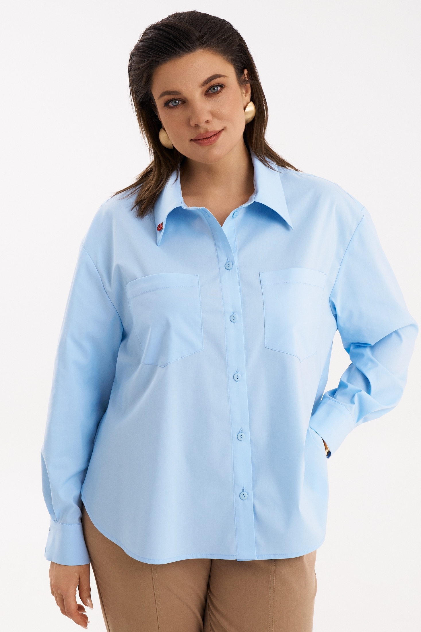 Базовая рубашка. Линия плеча спущена. Рукав длинный на манжете. По переду накладные карманы и застежка на петлю пуговицу. На воротнике пришит декоративный элемент в виде губ. Низ изделия фигурный.