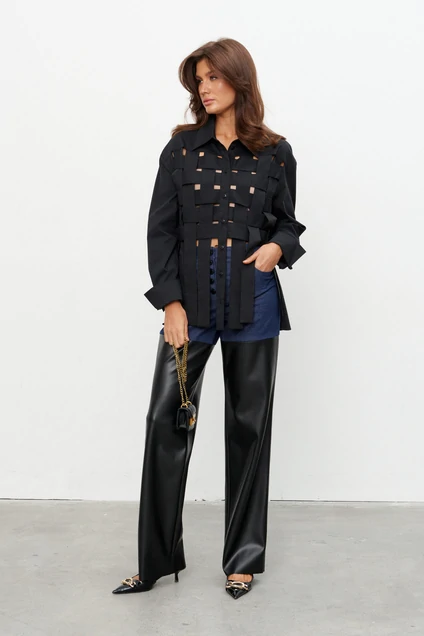 Хлопковая рубашка с дизайнерским решением по переду в виде переплетённых обтачных деталей. Линия плеча спущена, рукав с длинной манжетой, которую можно складывать пополам. Застёжка на планку с пуговицами спереди Длина 42-44р - 70,5см 46-48р - 71см Длина рукава с манжером 42-48р - 63см