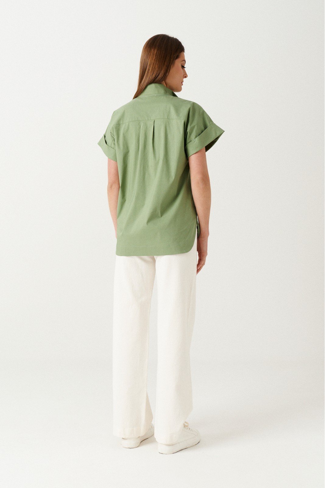Блузка свободного кроя выполнена из натурального полотна. Характеристики: свободный крой, воротник- стойка, рукав короткий цельнокроеный с отложной манжетой.