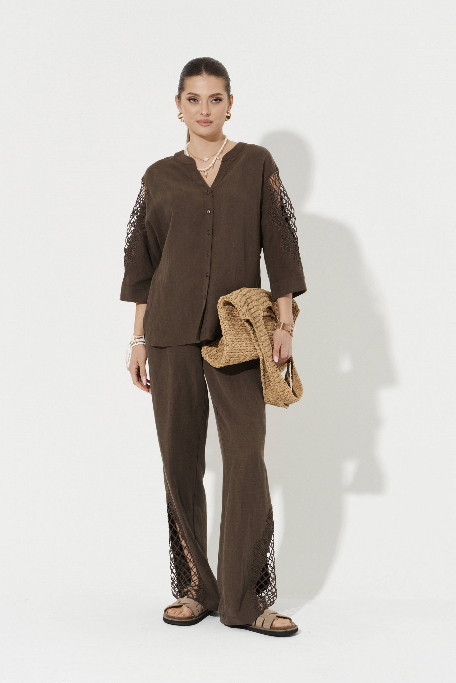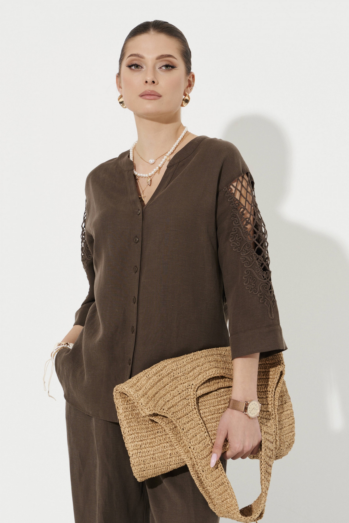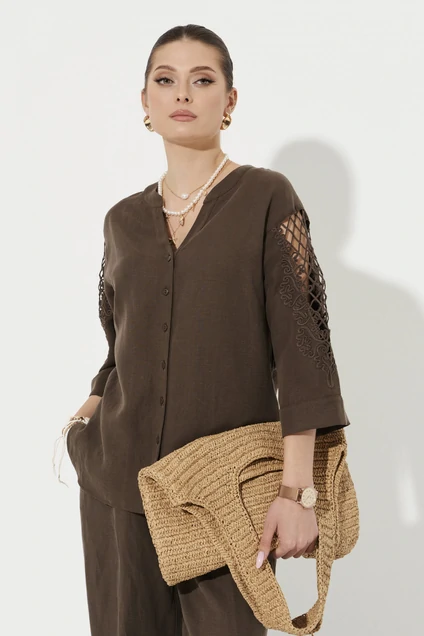Блузка женская из смесовой ткани с добавлением льна для повседневной носки. Блузка прямого силуэта. Застежка центральная бортовая на обметанные петли и пуговицы. Перед по низу короче, чем спинка и слегка скруглен. В боковом шве имеются небольшие разрезы по низу изделия. Горловина V-образная обработана отрезной стойкой и планкой. Линия плеча чуть спущена. Рукава втачные, длиной ниже локтя, на рукавах имеется дизайнерская вышивка в виде шнура. Низ рукава обработан притачной манжетой. Данная модель блузки в коричневом оттенеке будет отлично сидеть на любой фигуре, а также стильный фасон не оставит никого равнодушным. В данной блузке вы всегда будете в центре внимания.