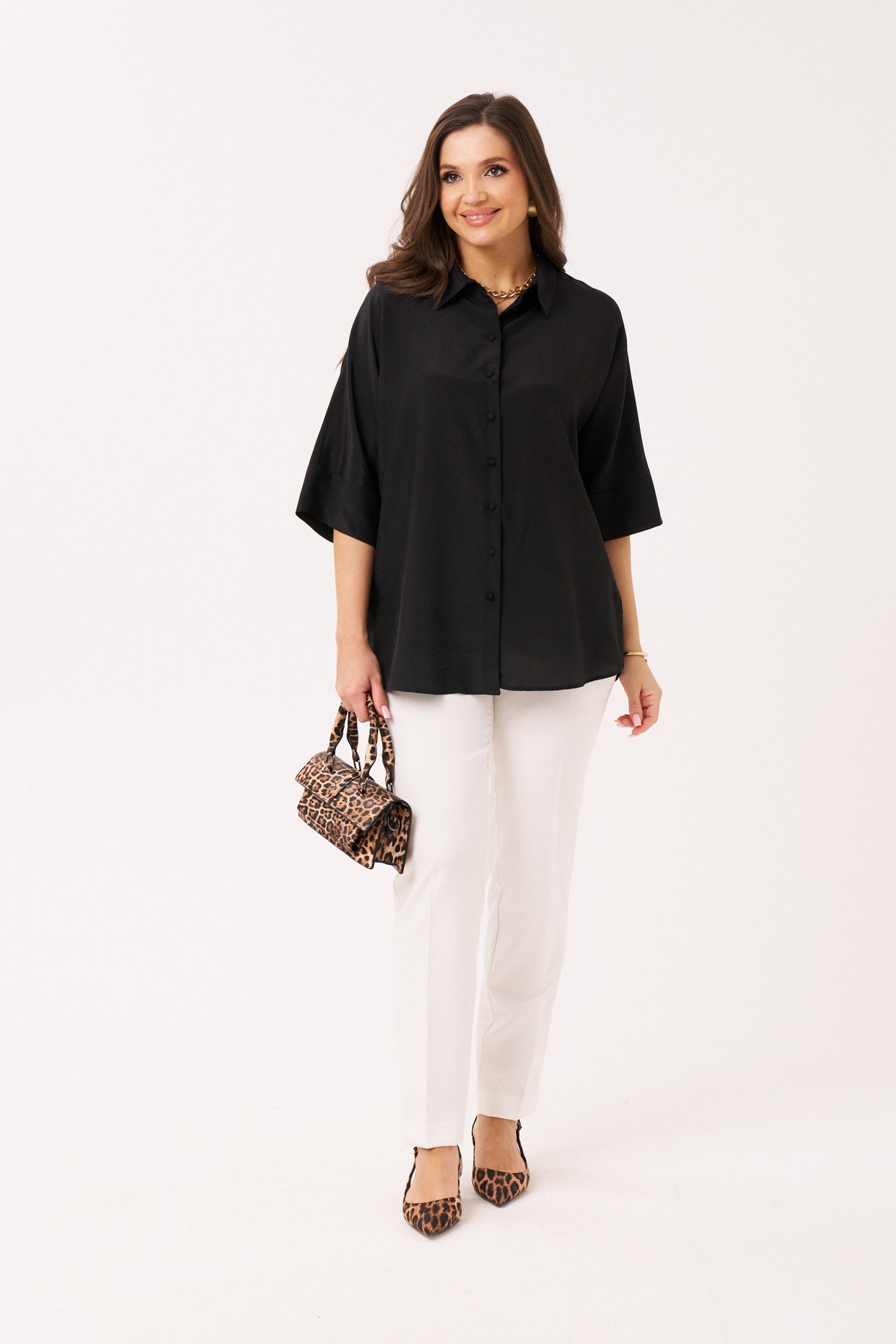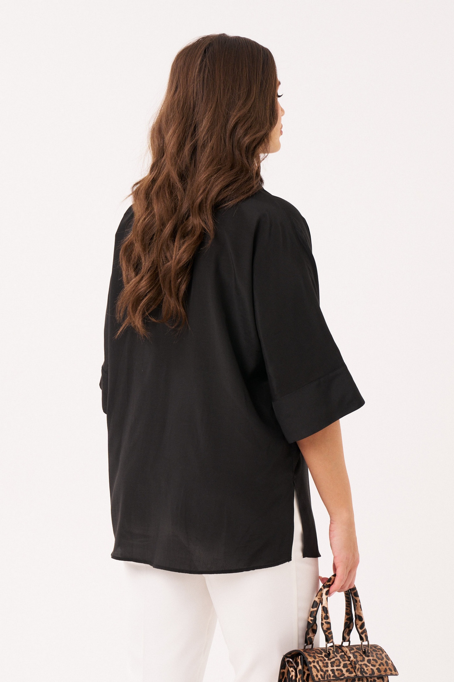 Блузка женская из смесовой ткани с большим содержанием хлопка для повседневной носки. Застежка центральная бортовая на обметанные петли и пуговицы. В боковых швах имеются небольшие разрезы. Горловина обработана рубашечным воротником с отрезной стойкой. Рукава цельнокроеные, длина чуть ниже локтя, низ рукава обработан притачной манжетой. Красивая и легкая блузка в черном цвете станет не заменимой вещью в вашем гардеробе.