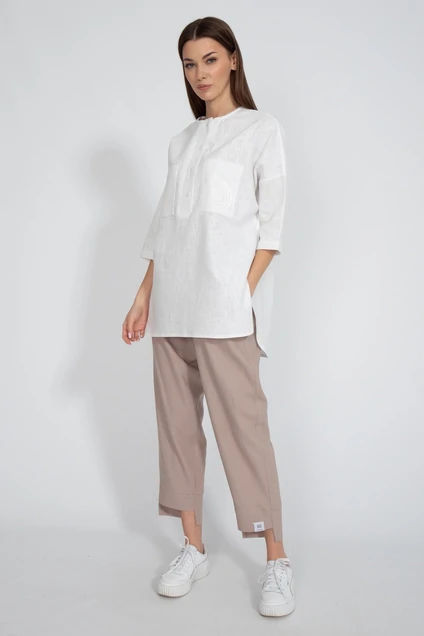 Рубашка лен свободного кроя со спущенными рукавами и накладными карманами, застежкой поло. Удлиненная по спинке, с разрезами в боковых швах. Прекрасно сочетается с шортами модели 4074, брюками модели 4076, джоггерами модели 4082. Ткань лен. Рост 170