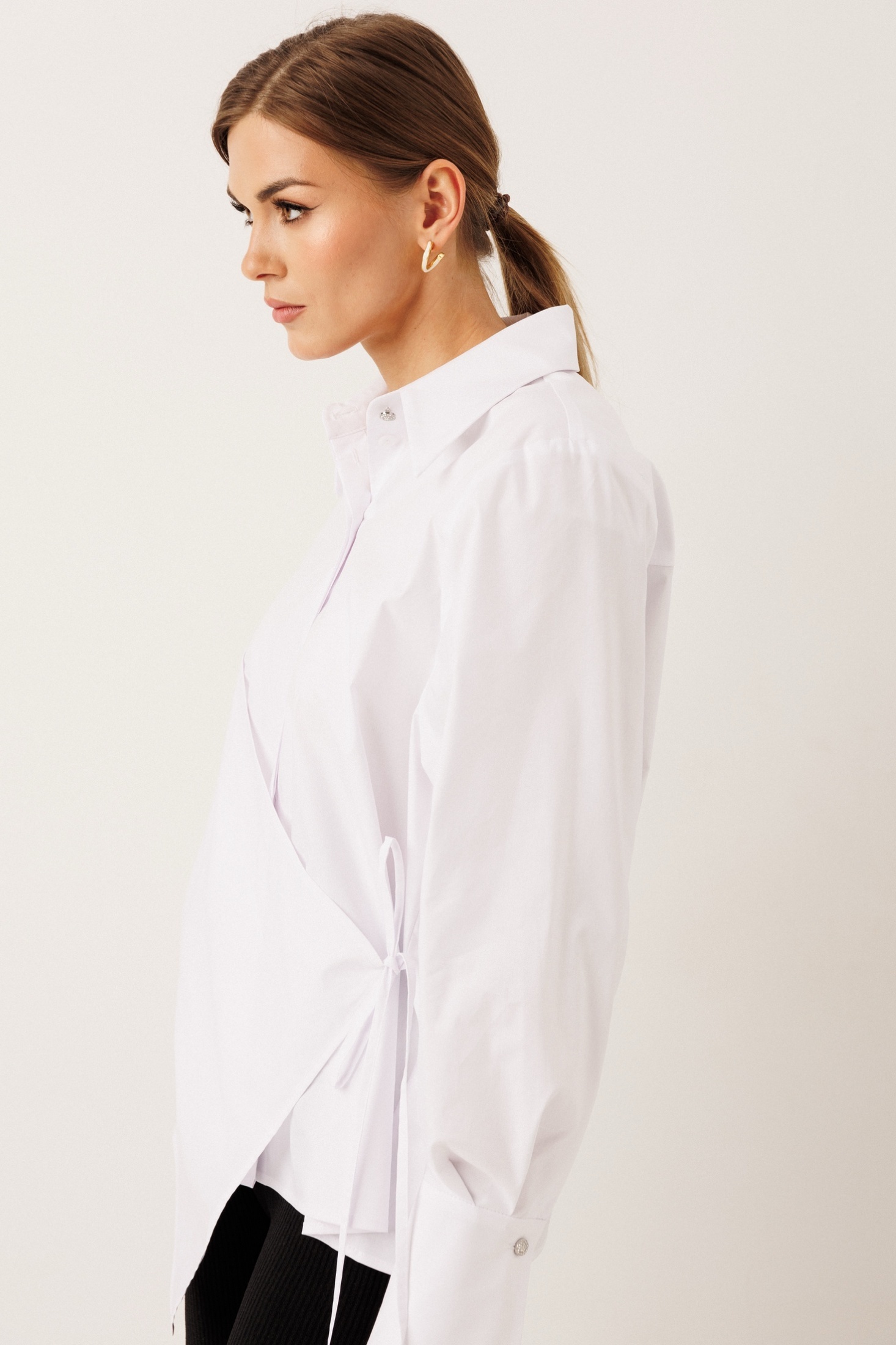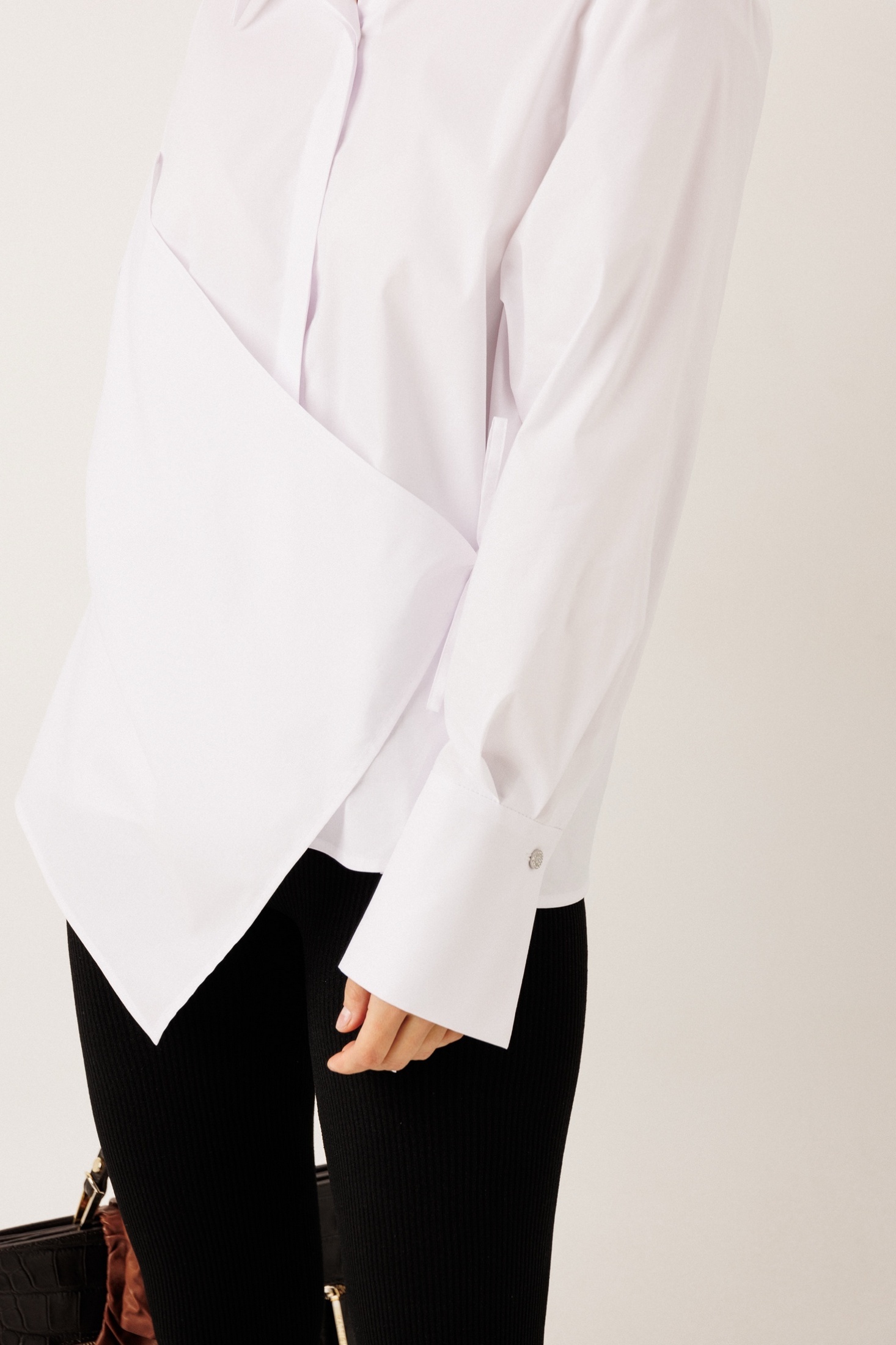 – по переду — фигурная деталь с асимметричным кроем, слева на завязке