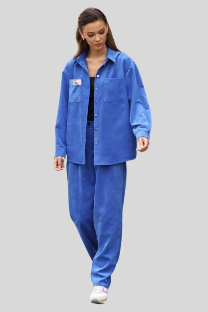 Эта стильная женская рубашка представлена в насыщенном синем цвете, что делает ее исключительно выразительной и модной. Рубашка выполнена из мягкой бархатистой ткани (вельвет), обеспечивая комфортное ношение на протяжении всего дня. Она имеет классический воротник, полную пуговичную планку и длинные рукава, что придает изделию официальный вид. Просторный крой обеспечивает свободу движений, делая эту рубашку идеальным выбором как для офиса, так и для повседневной носки. Дополнительные детали, такие как простой карман на груди, подчеркивают практический и одновременно стильный дизайн. Изделие спроектировано так, чтобы легко сочетаться с разнообразными элементами гардероба - от джинсов до более официальных брюк или юбок. Эта рубашка - идеальный выбор для тех, кто ценит удобство, стиль и качество в одежде.