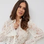 Невероятно нежная и стильная блуза прямого кроя с нагрудными вытачками. Рукав втачной, по низу присборен на эластичную тесьму и дополнен притачной кружевной манжетой. Застежка центральная на пришивные пуговицы. Воротник отложной на стойке. Блуза выполнена из красивого нежного бархатного кружева премиум качества. Длина блузы от плечевого шва 67см. Длина рукава 69 см.