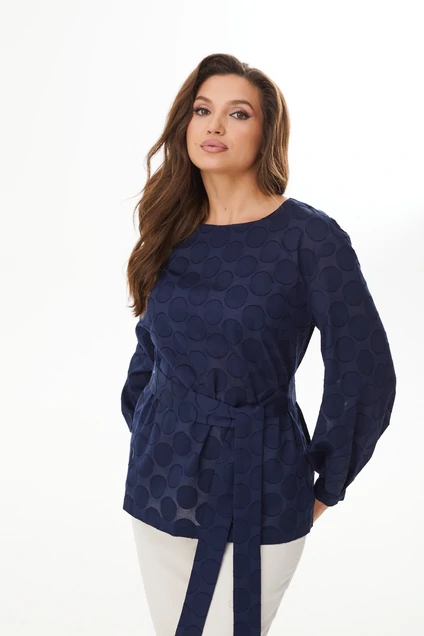 Блузка прямого силуэта. Горловина в форме закругленной лодочки. Рукав втачной, расширенный книзу, собран на манжету с застежкой-пуговицей. Снизу по бокам разрезы, застежка по горловине на 2 пуговицы и воздушные петли. В комплекте пояс.