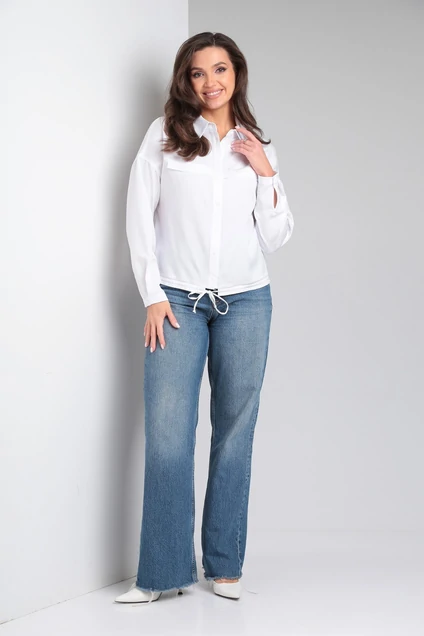 Стильная укороченная женская рубашка свободного силуэта с кокетками спинки и полочек и спущенной линией плеча. Застежка на планку петля-пуговица. Рукав длинный прямой, втачной с манжетой на застёжку петля-пуговица. По низу изделия притачной пояс со шнурком для стяжки и завязывания. По воротнику, по кокеткам и по плечевым швам отделочная строчка. На модели размер 48 (параметры модели ОГ-90. ОТ-71. ОБ-102 рост 173см)
