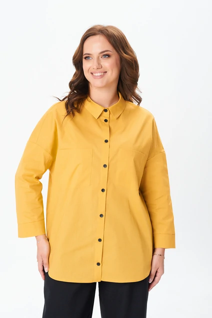 Стильная рубашка свободного кроя с центральной планкой на застежку петли-пуговицы и накладными карманами по переду. Плечо изделия спущено. Рукав 7/8 прямой с широкой манжетой. Воротник со стойкой. Спинка изделия цельная. Низ изделия фигурный отстрочен отделочной строчкой.
